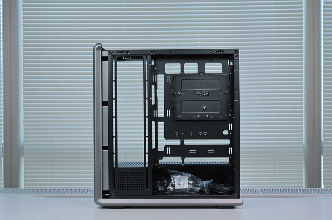 机箱背线空间充沛,方便玩家理线。主板拖背面有一块可拆卸的硬盘支架,支架可同时安装1块3.5寸和1块2.5寸SATA硬盘,电源仓中也提供了可以安装1块3.5寸或1块2.5寸SATA硬盘的支架。宽敞的机箱电源仓中最大可支持安装长度不超过200mm的ATX规格电源。