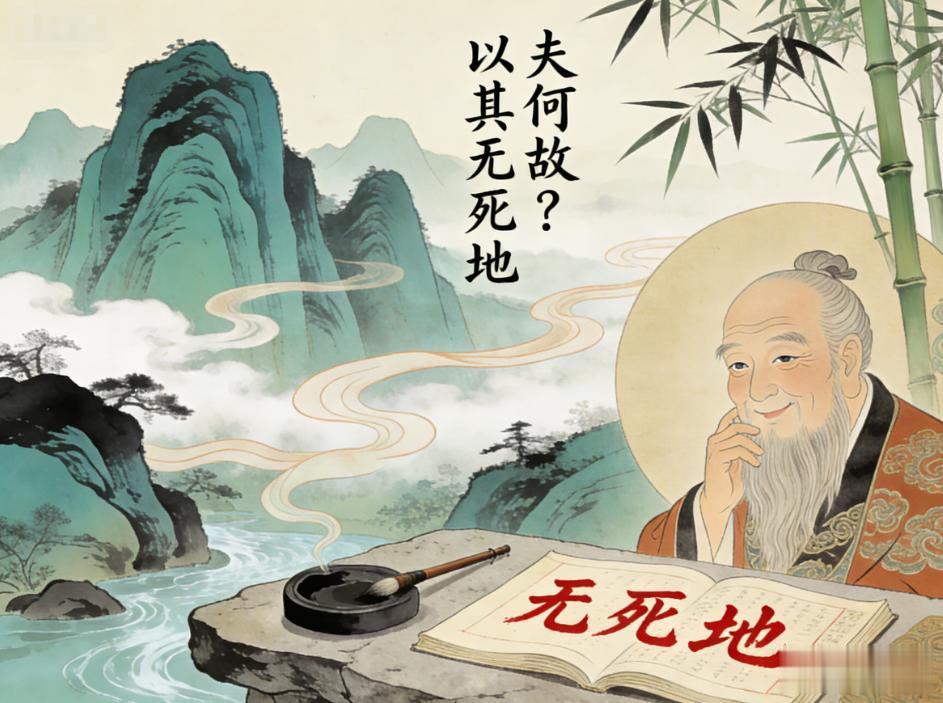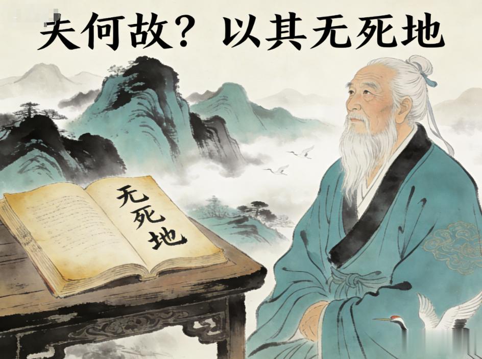 “无死地”:道家生命观的深度剖析“夫何故?以其无死地。” 老子在《道德经》第五十章中的这一结语,如同一把钥匙,为我们打开了道家生命观的深邃之门。“无死地”,这看似简单的三个字,蕴含着无尽的智慧,它既是对前文 “善摄生者” 境界的深刻总结,更是道家养生思想的核心所在。