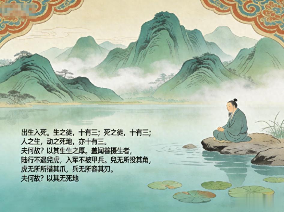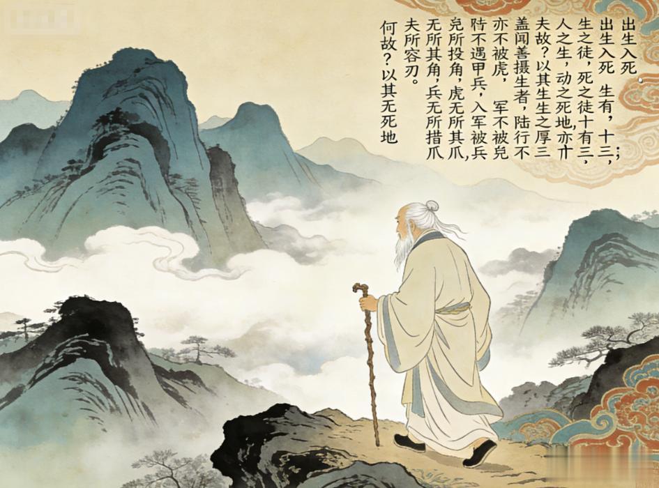 出生入死。生之徒,十有三;死之徒,十有三;人之生,动之死地,亦十有三。夫何故?以其生生之厚。盖闻善摄生者,陆行不遇兕虎,入军不被甲兵。兕无所投其角,虎无所措其爪,兵无所容其刃。夫何故?以其无死地。