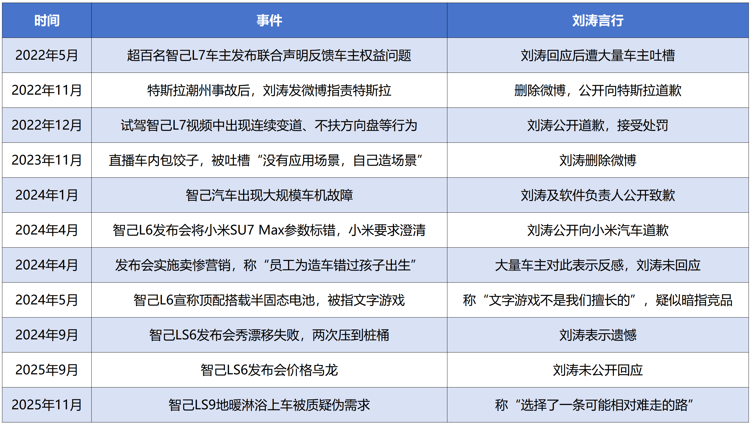这并非刘涛首次因出格言论和营销“翻车”。据新浪科技梳理,从2022年到现在为止,他至少公开道歉4次:2022年为宣传智己L7试驾时高速违停、变道不打灯道歉;2024年因智己L6发布会标错小米SU7电机参数致歉,还曾因大规模车机故障认错;期间更有“后排包饺子”“装淋浴花洒”等营销操作引发“伪需求”争议。