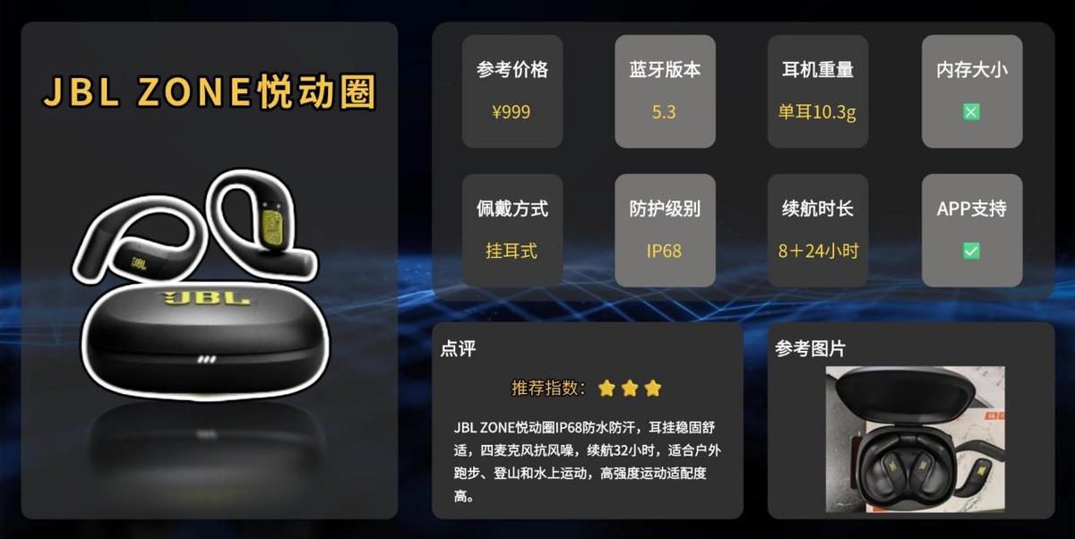 JBL是国际知名音频品牌,在运动耳机领域的布局成熟,强调动感调音与场景功能。JBL ZONE悦动圈在品牌序列中属于高防护级别、偏户外硬核运动定位。