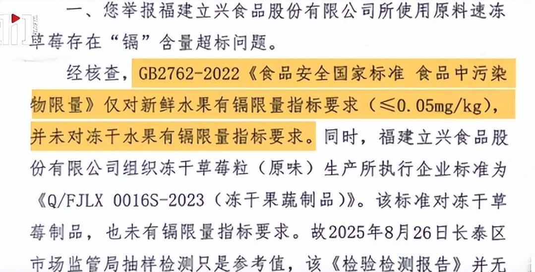 魔幻的是,当她拿着这份触目惊心的报告去举报供应商时,地方监管部门竟然回复:没法管,因为国家标准里没有专门针对“冻干草莓”的镉限量规定。一个年规模上百亿的网红零食,居然活在监管的“灰色地带”里。