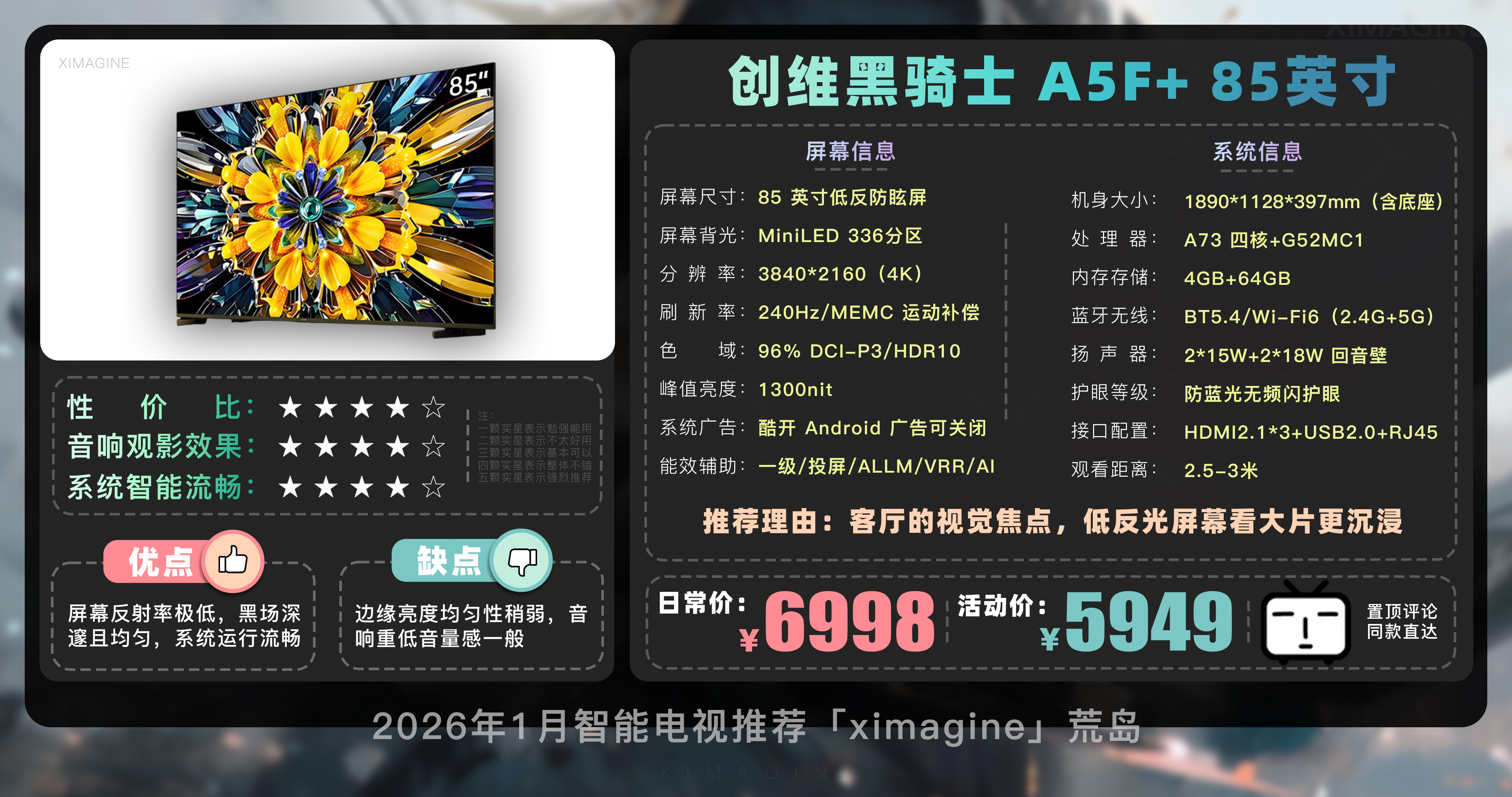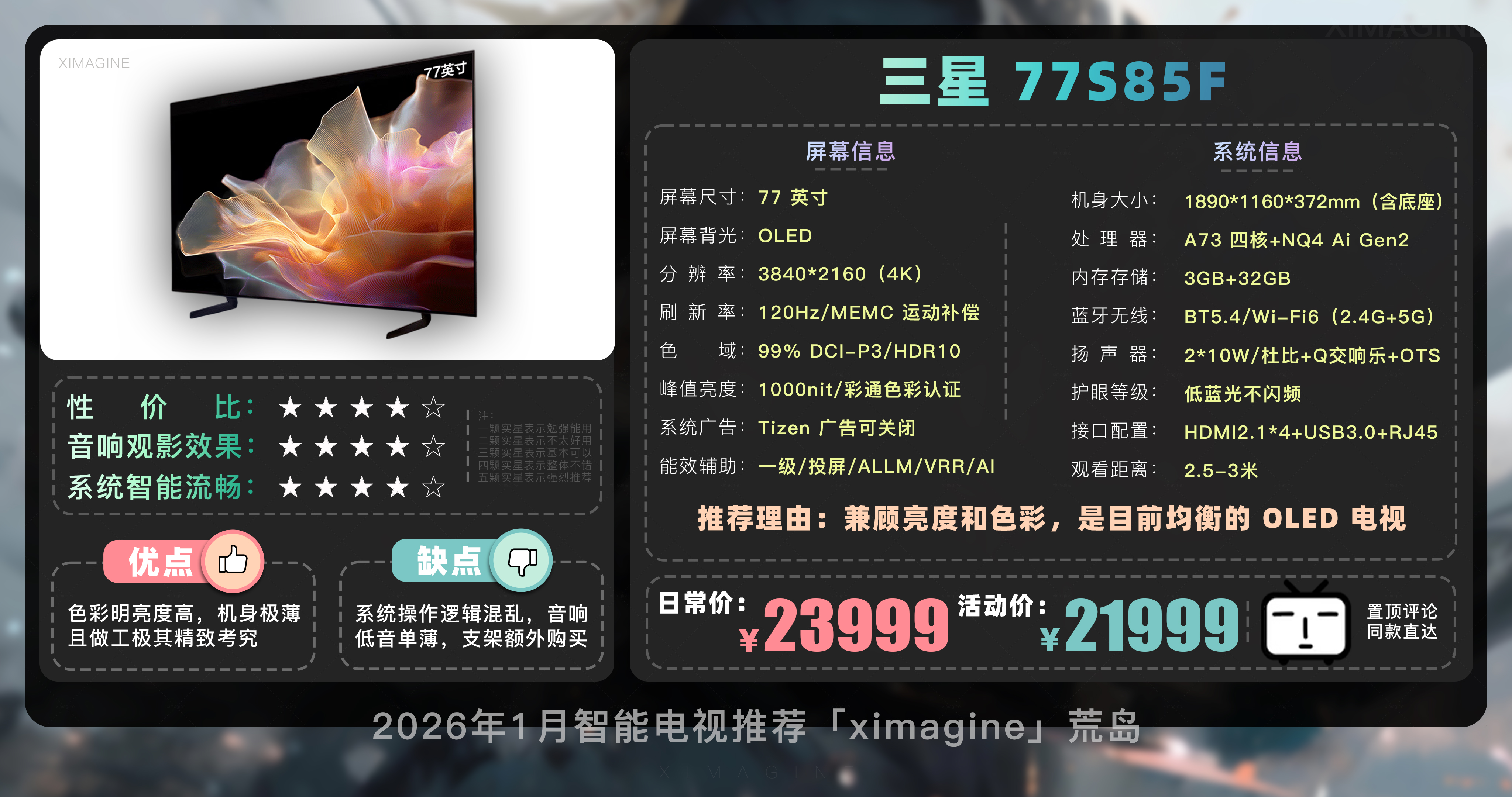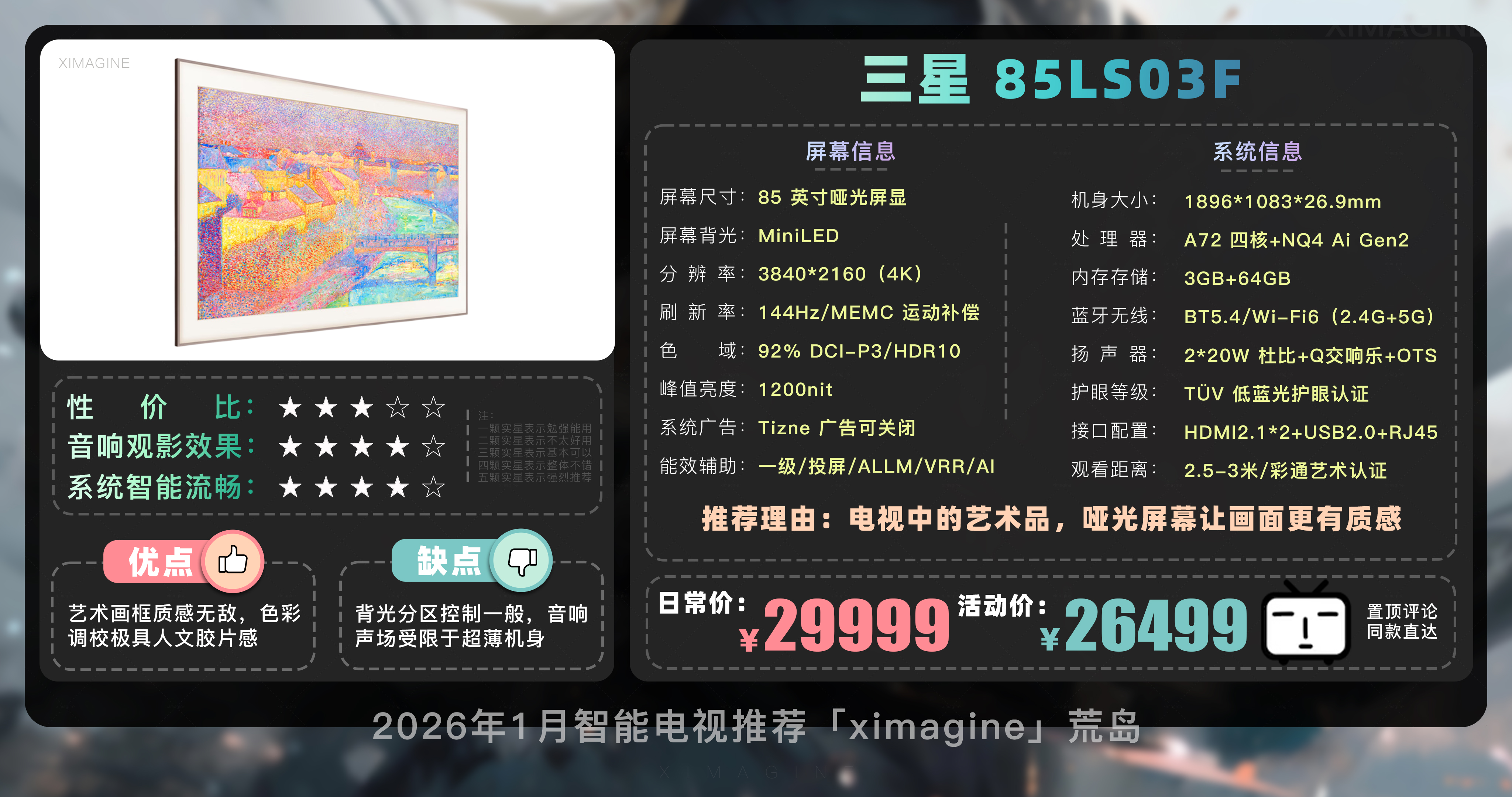 以上就是本期26年1月智能电视推荐清单,如果有心水的型号,可以戳置顶评论区对应链接拿下!买电视只需要问自己三个问题:我的客厅够不够大?我是在什么光线下看球追剧?我能不能忍受那糟心的广告和卡顿?显示技术的进步是为了服务眼睛的,而不是为了增加账单的。如果觉得内容有所帮助,请关注荒岛!如果对选购智能电视还有疑问,欢迎在评论区留言我会尽快回复大家。本期就到这,我是「ximagine」下期再会!