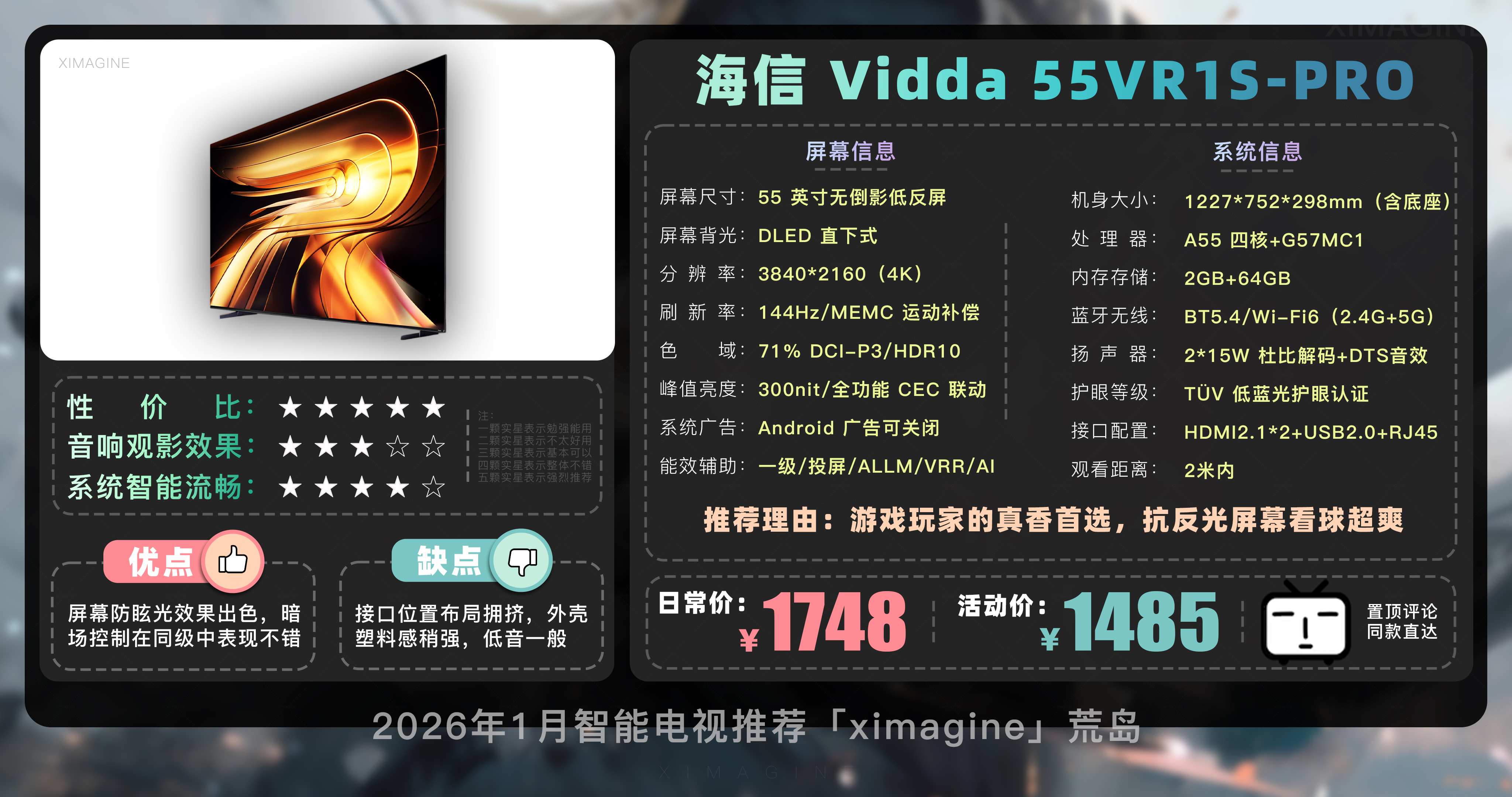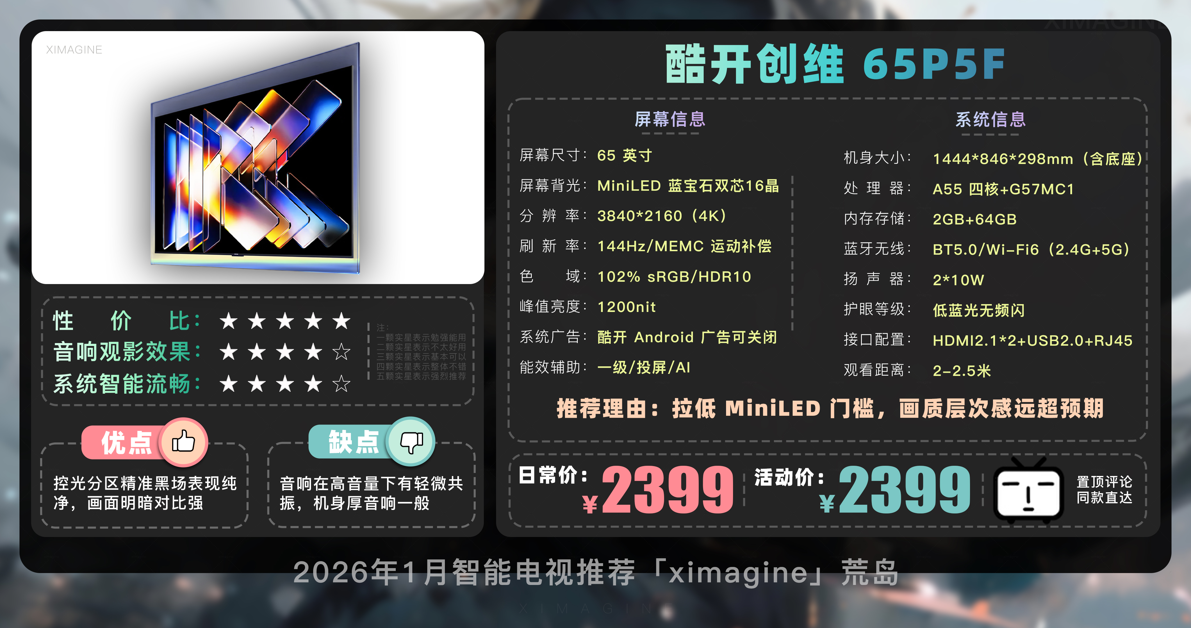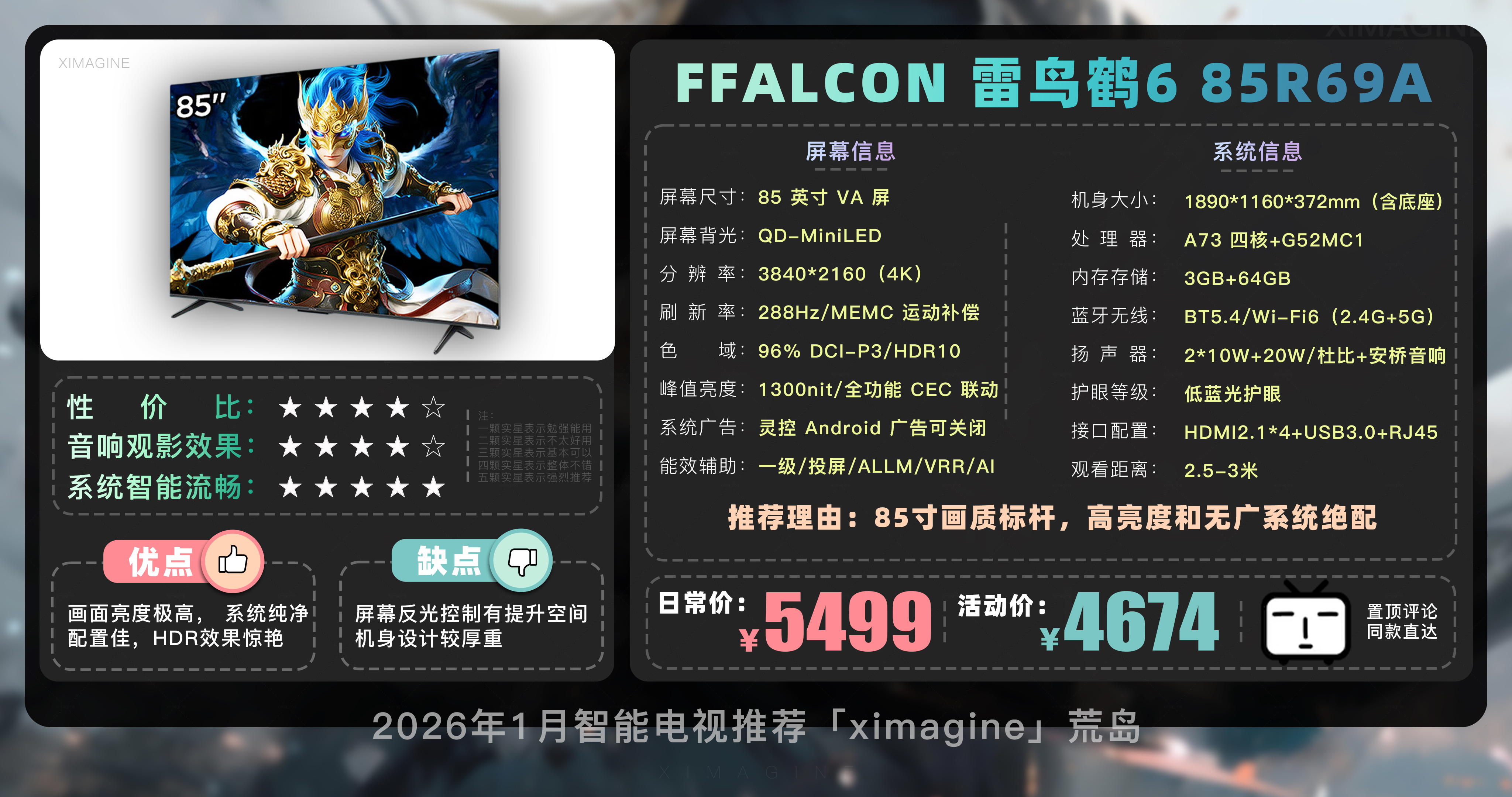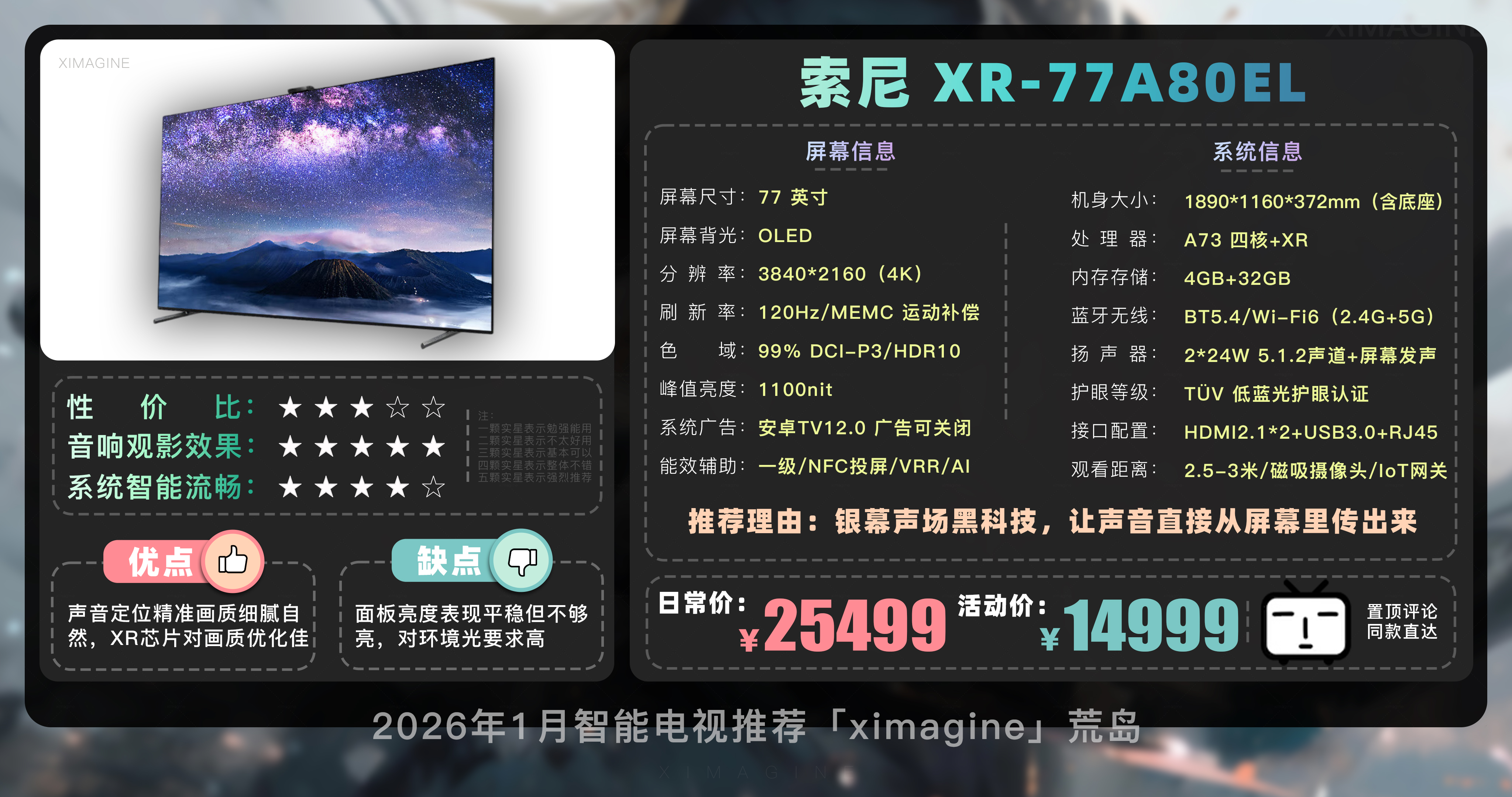 以上就是本期26年1月智能电视推荐清单,如果有心水的型号,可以戳置顶评论区对应链接拿下!买电视只需要问自己三个问题:我的客厅够不够大?我是在什么光线下看球追剧?我能不能忍受那糟心的广告和卡顿?显示技术的进步是为了服务眼睛的,而不是为了增加账单的。如果觉得内容有所帮助,请关注荒岛!如果对选购智能电视还有疑问,欢迎在评论区留言我会尽快回复大家。本期就到这,我是「ximagine」下期再会!