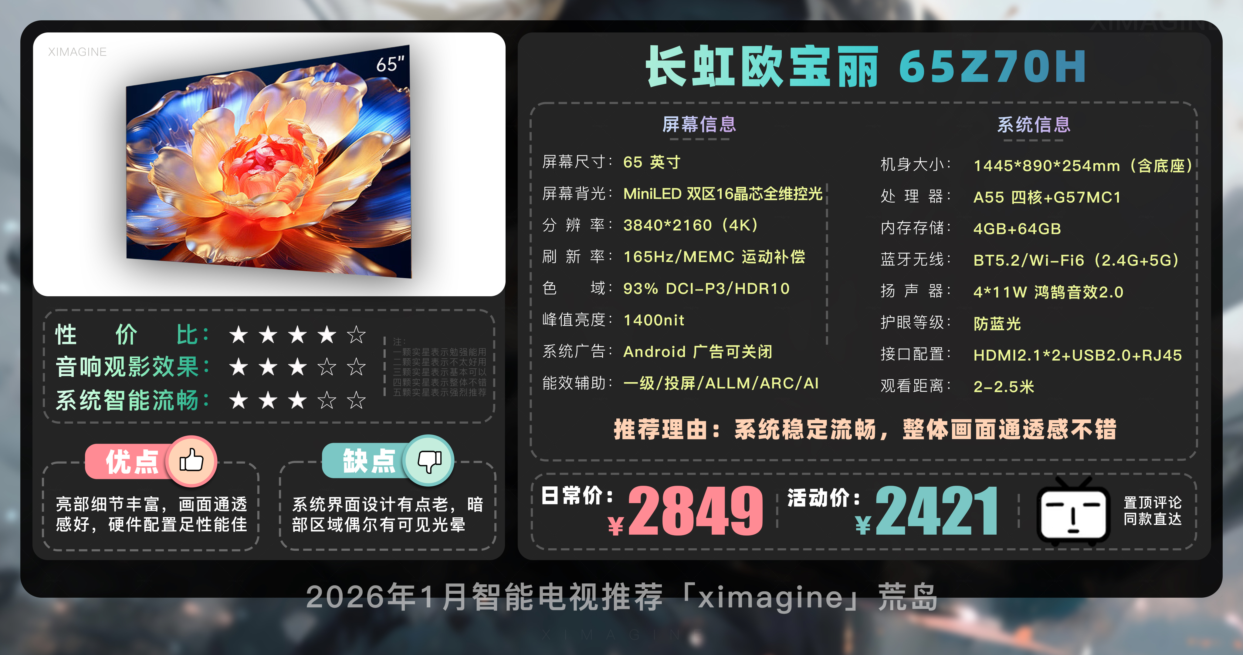 长虹欧宝丽 65Z70H 流露出一种老牌大厂的稳重感,更注重亮暗过渡的丝滑程度,让画面看起来更有层次感,在观看体育赛事时,动态补偿让高速移动的球变得清晰可辨,完全没有眩晕感。系统的界面设计非常人性化,大图标和简易的操作逻辑对长辈非常友好。机身使用了不少金属材质,散热效率不错,长时间运行后屏幕表面的温升并不明显。2421 元的它音响部分针对人声做了专门的加重处理,在看新闻或者访谈节目时,听感非常扎实,有一种面对面交谈的真实感。