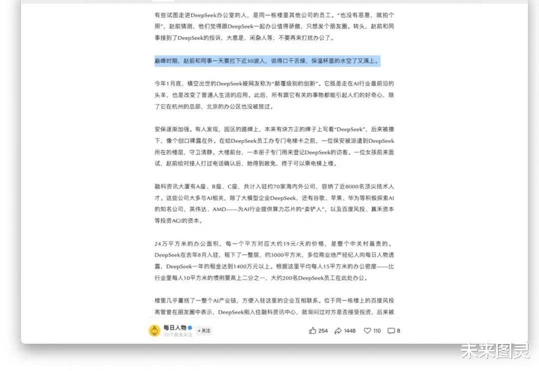 而彼时,DeepSeek北京融科资讯中心的办公室,已成了科技圈“朝圣地”。公司园区有英伟达、AMD、苹果、intel、华为、ARM等知名的AI公司以及百度风投、襄禾资本等投资公司。其物业公司还在DeepSeek所处楼层单独加装了闸机,并增设了安保人员。据“每日人物”报道中指出,前台老赵和他同事他每天要拦下近30波试图闯入写字楼的陌生人。