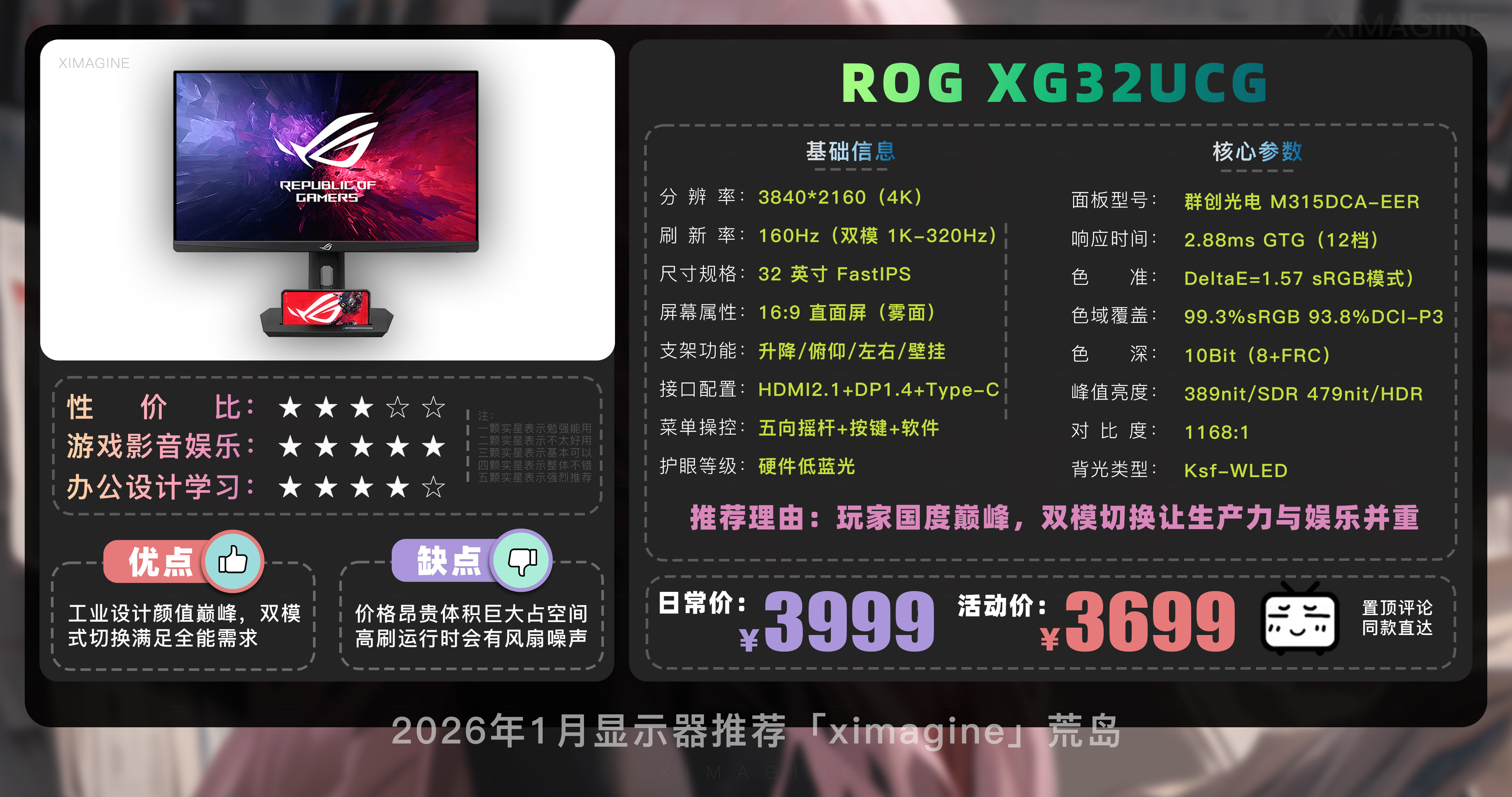 以上就是本期26年1月游戏电竞显示器推荐清单,如果有心水的型号,可以戳置顶评论区对应链接拿下!显示器是通往另一个世界的窗口,我们每天都有相当长的时间面对着这块屏幕,别让好显卡憋屈在烂屏幕里,别让灵感荒废在偏色的像素里,如果觉得内容有所帮助,请关注荒岛!如果对选购显示器还有疑问,欢迎在评论区留言我会尽快回复大家。本期就到这,我是「ximagine」下期再会!