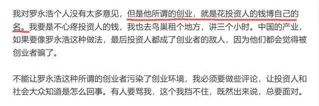项立刚还吐槽罗永浩创业是“花投资人的钱博自己的名”,直言要站出来阻止罗永浩“污染了创业环境”。