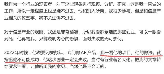 还强调自己2022年就预判罗永浩AR创业会失败,当时有行业大佬把文章转给他,可惜没被采纳。如今AR项目无下文,正好印证自己的判断,并且罗永浩绝对反驳不了。