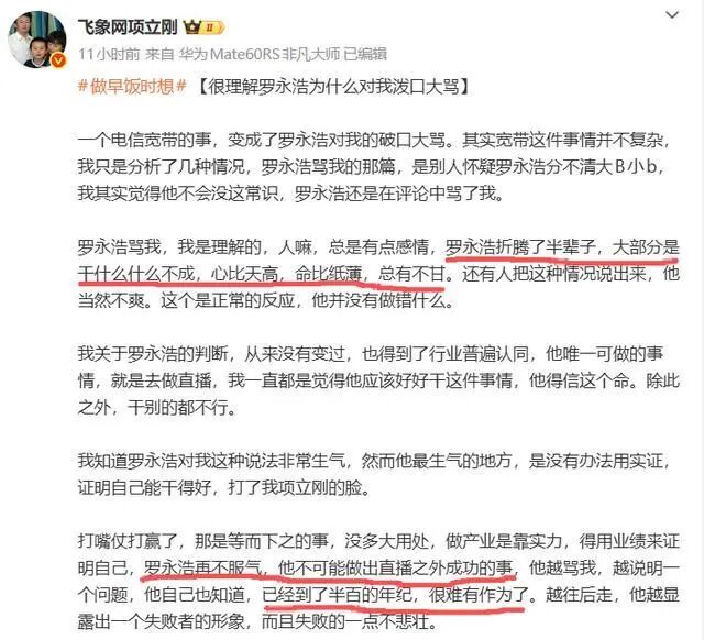 项立刚迅速长文反击,言辞激烈,直指罗永浩“折腾半辈子干啥啥不成”、“心比天高命比纸薄”,断言其除了直播带货外一事无成,甚至劝他“信命”。
