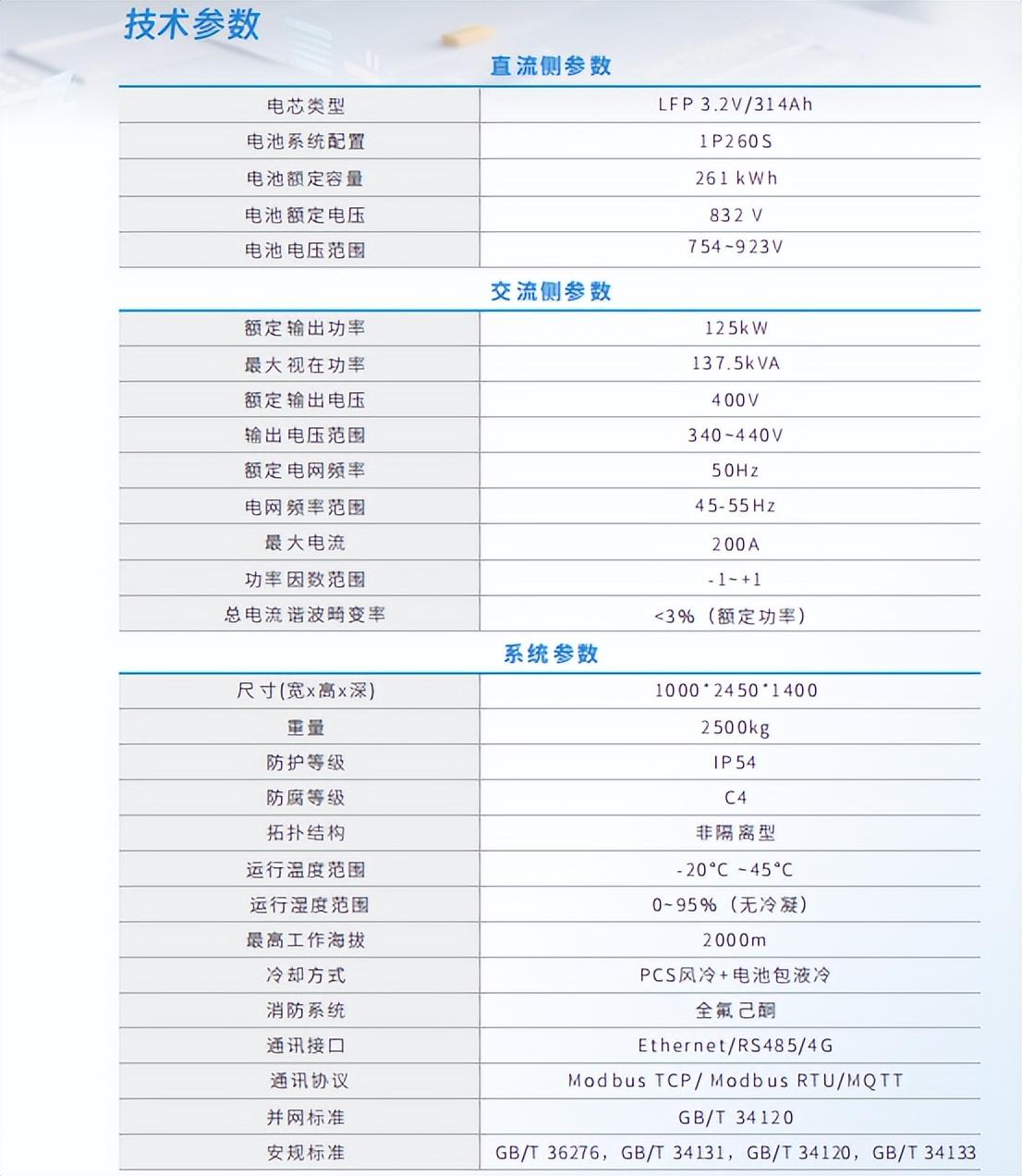 安全是储能系统的核心诉求,AESB-125/261-L 构建了 “电芯 - 模组 - 簇 - 系统” 四级电气保护体系,从电池单体到整个系统层面全方位防范安全风险。消防方面,集成 “探测(感温、感烟)+ 抑制(全氟己酮)+ 泄爆 + 气体消防 + 水消防” 的立体消防系统,遵循 “早发现、早处置、防蔓延” 的安全原则,对电池舱和电气舱的火灾风险进行有效探测和抑制,为系统安全运行筑牢防线。产品防护等级达 IP54,防腐等级为 C4,可耐受户外恶劣环境,适应多场景安装需求。