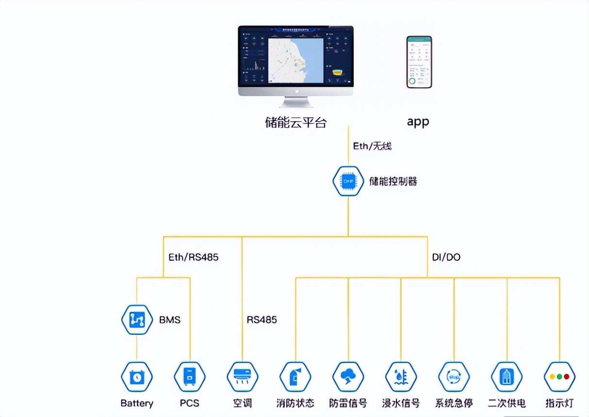 电池管理系统(BMS):采用二级架构(BMU+BCU),精准采集电池电压、温度等参数,实现充放电管理、热管理、单体均衡管理和故障报警,保障电池安全高效运行。
