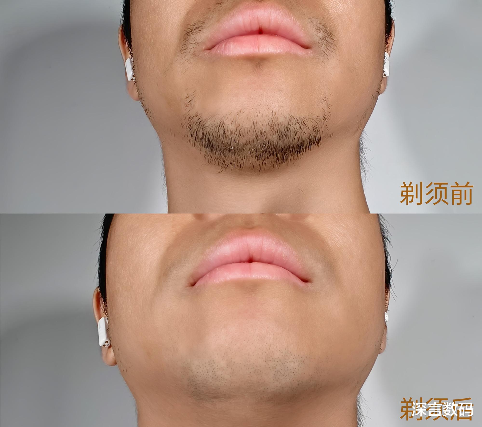 剃须刀还得看实际效果,积攒了三天比较粗硬的胡须刚好能测试,只需来回两次便可以剃干净,而且没有卡肤或拉拽胡须不舒适感,刀网弧度很好的贴合脖颈的凹陷处,超薄8K顺滑刀面滑过皮肤时并没那种生硬的摩擦感,完成剃须后皮肤也没泛红等情况,运行噪音可接受范围内不会影响到他人休息。