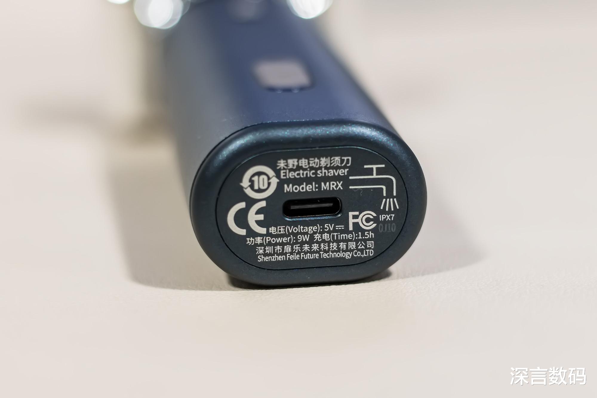 机身底部为USB-C充电接口,电量充满需时约为1.5小时,通用充电接口兼容性高,接口外侧印了部分参数规格,侧边还有防水等级的标识,未野MRX往复式剃须刀的防水等级为IPX7,有效隔绝水液侵入核心部件,意味着其支持用水冲洗表面都不会造成损坏。
