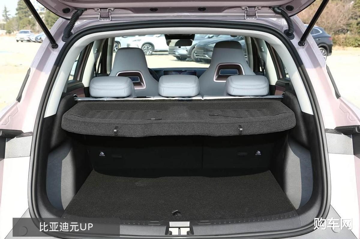 如果说是节假日出游或是周末去春游露营,那后备厢的储物就更关键了。元UP的后备厢容积是340L,放两个大行李箱可能就差不多了,24寸或更小一些的能放得下三个,大部分场景也够用。而全新Q05的后备厢则达到了540L,而且它有一个下沉式的结构设计、可实现双层储物,也能把帐篷、防潮垫之类的大件放下后,再塞进一些零碎的户外折叠凳等等小装备。如果你对载物空间有较高要求,它的宽容度确实会更高。