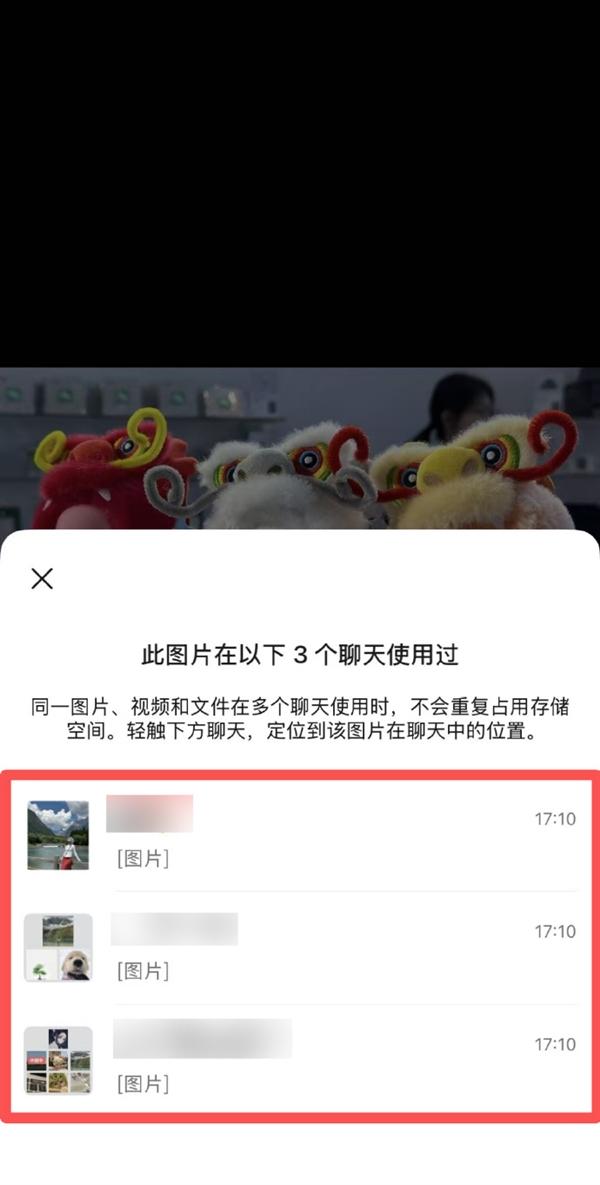 “同一图片、视频和文件在多个聊天使用时,不会重复占用存储空间。”