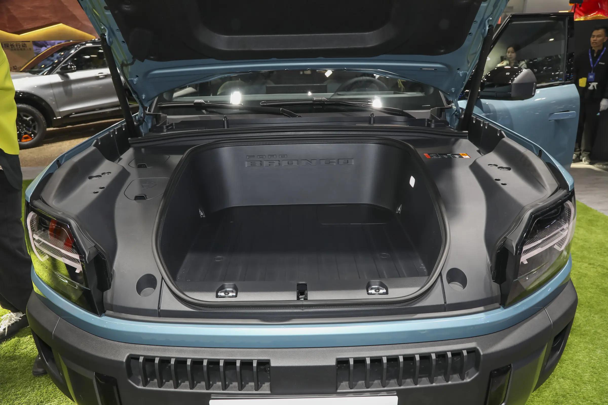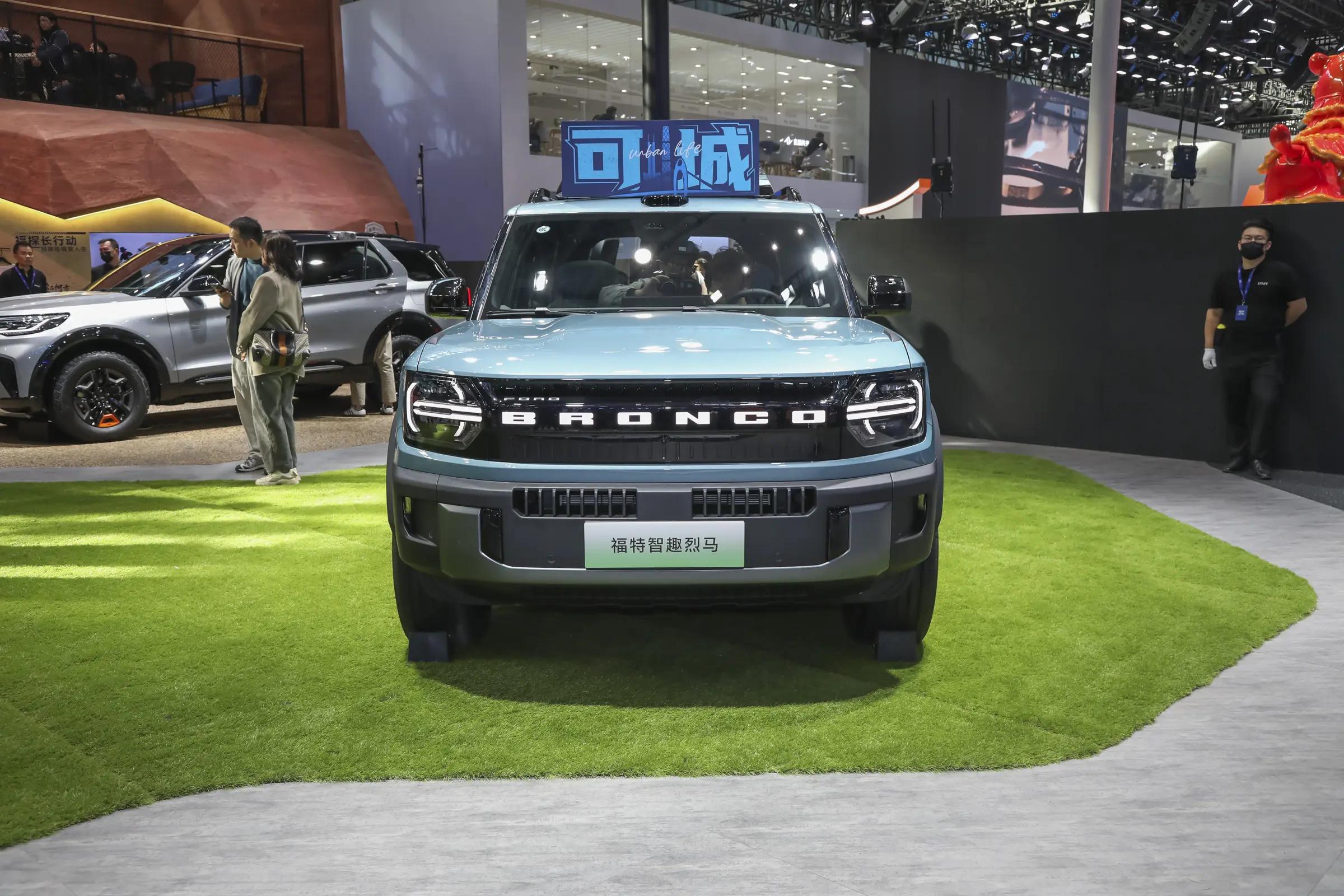 外观方面,福特智趣烈马在Bronco Sport设计思路的基础上做了进一步的升级调整,前脸部分黑色的粗壮中网与两侧大灯组相连接,呈贯穿式造型,中央有着硕大的“BRONCO”英文LOGO,车头的下方还有着向外突出的下包围,视觉效果十分硬朗。