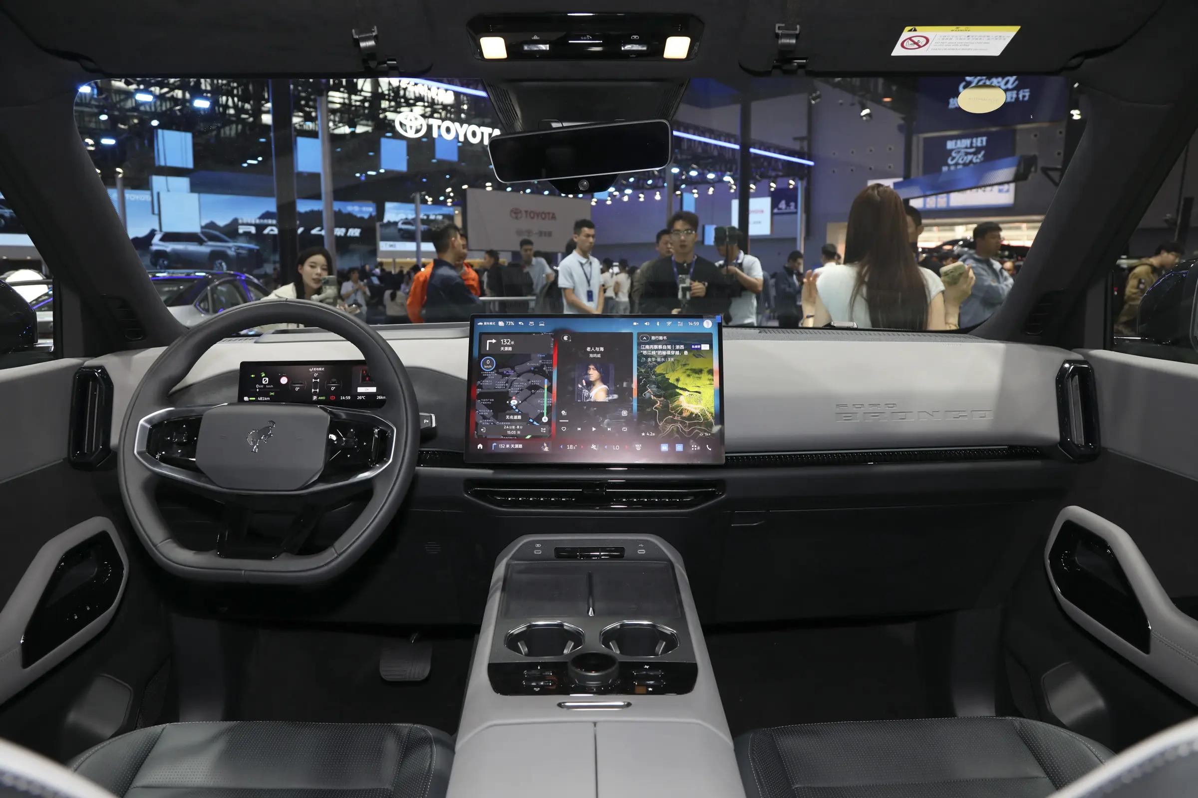 内饰方面,福特智趣烈马采用了极简式设计风格,怀挡式换挡杆为手机无线充电面板、杯架腾出了位置,在杯架的后方还带有少量的实体按键,可以用来实现驾驶模式、空调和音量的调节。15.6英寸2.5K Mini-LED中控屏内部搭载了高通骁龙8255芯片,支持手机互联、四区域语音识别控制、面部识别等功能的同时,还配有越野360全景系统以及智能旅行路书等功能。