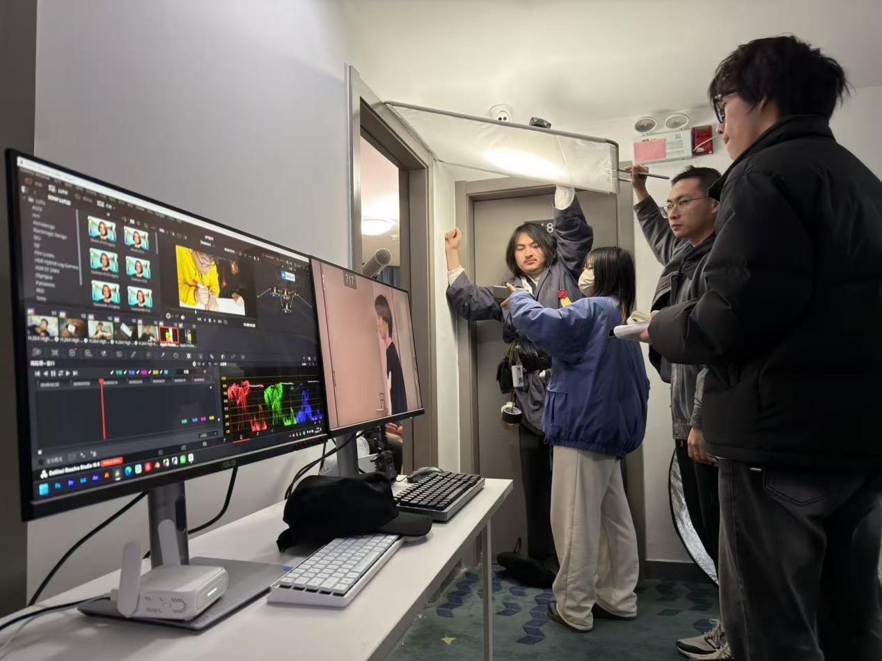 更值得一提的是,华硕ProArt 创梦5K专业显示器不仅承担了监看角色,还在片场实现了素材的初步调色。借助其专业级色彩准确度与稳定表现,剧组可以在拍摄间隙,对关键镜头进行快速色彩校正与风格预览。这一改变,直接打破了传统“拍摄—导出—后期再统一调色”的割裂流程。通过在现场完成部分调色工作,学生团队能够即时验证画面风格是否符合预期,从而在拍摄阶段就进行针对性调整,大幅减少后期返工的可能性。对于时间紧张的校园创作项目来说,这种前后期融合的工作方式尤为关键。它不仅提升了整体制作效率,也让创作者能够更加专注于内容表达本身,而非被技术流程所束缚。