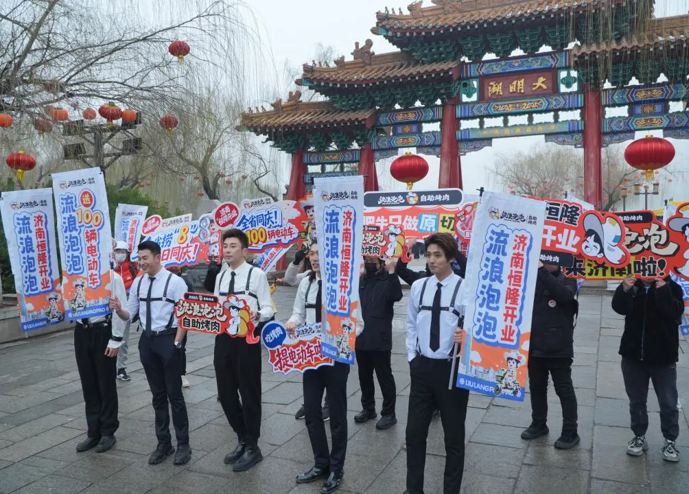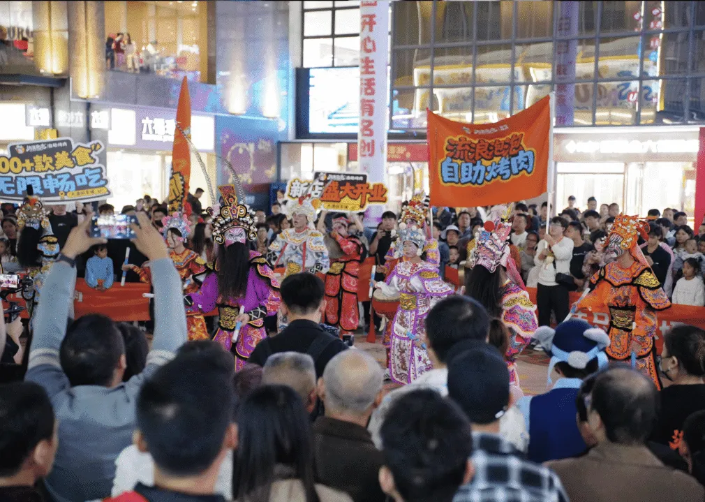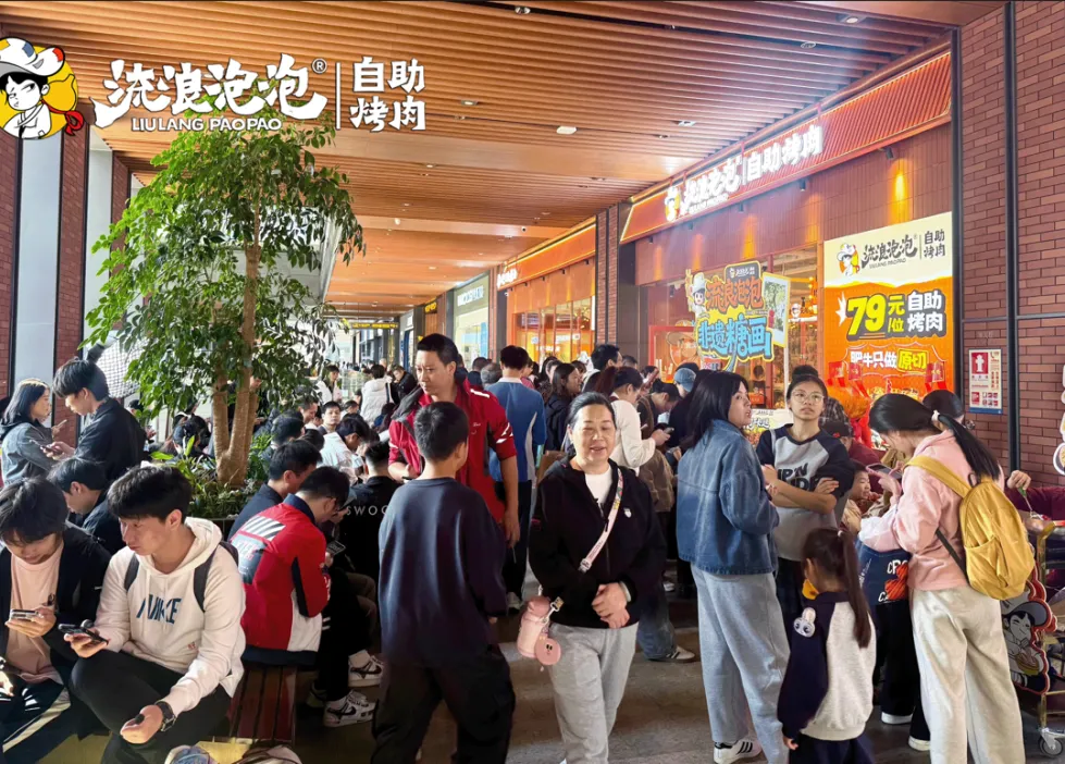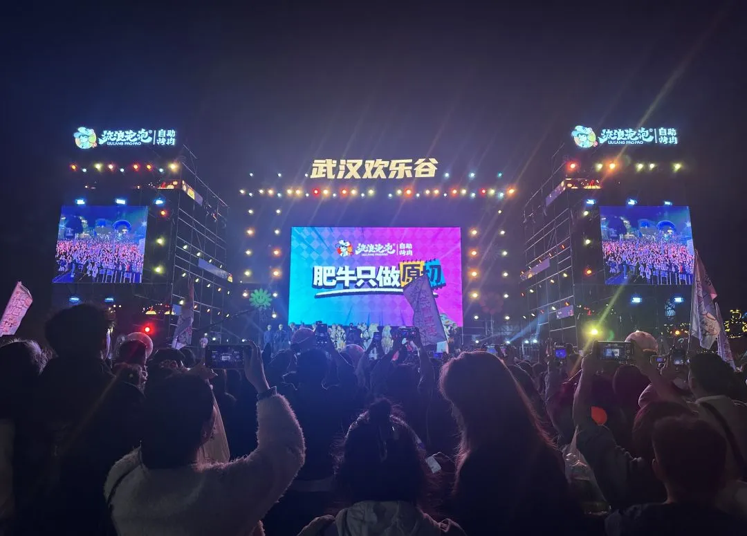 这套体系已在多城落地验证——济南恒隆广场店以“吃烤肉提电动车”城市级福利搭配男团巡游,快速登顶本地热点;深圳三店同开打造“非遗潮玩烤肉盛宴”,首日排队超千桌、自发短视频超万条;杭州双店以西湖千平巨型报纸、品牌主题热气球强势造势,迅速引爆城市热度;武汉欢乐谷次元嘉年华打造沉浸式狂欢场景,精准触达年轻客群并显著带动门店增长。