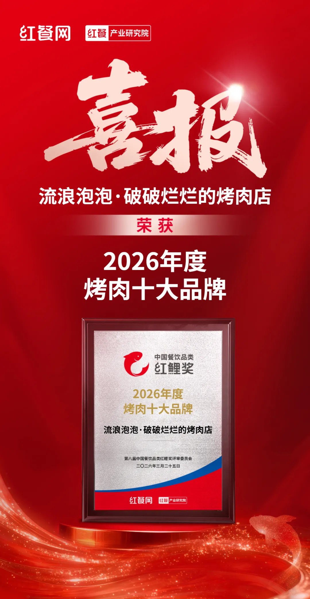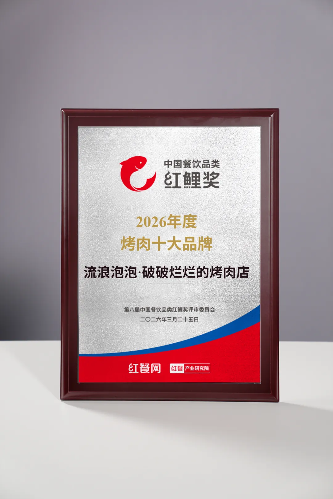 3月25日,由世界中餐业联合会、红餐网联合主办的2026中国餐饮产业节暨“第八届中国餐饮品类红鲤奖”颁奖盛典在杭州举办。作为国内餐饮细分赛道极具影响力的权威评选,红鲤奖旨在表彰各赛道中兼具实力与创新力的标杆品牌。本届评选中,流浪泡泡凭借强劲的综合实力与市场口碑,首次荣获2026年度烤肉十大品牌。