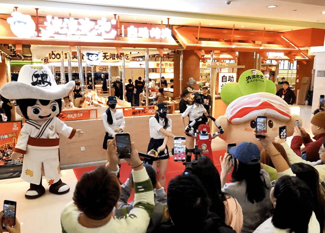体验端,品牌在“演艺+用餐”的模式上不断升级场景互动:无锡门店引入LIVE HOUSE沉浸式演出,郑州门店推出节日专属宠粉活动与女团互动,杭州门店引入人形机器人担任限定店员,提供迎宾、送餐、舞蹈互动等特色服务,以科技感体验强化门店话题性。