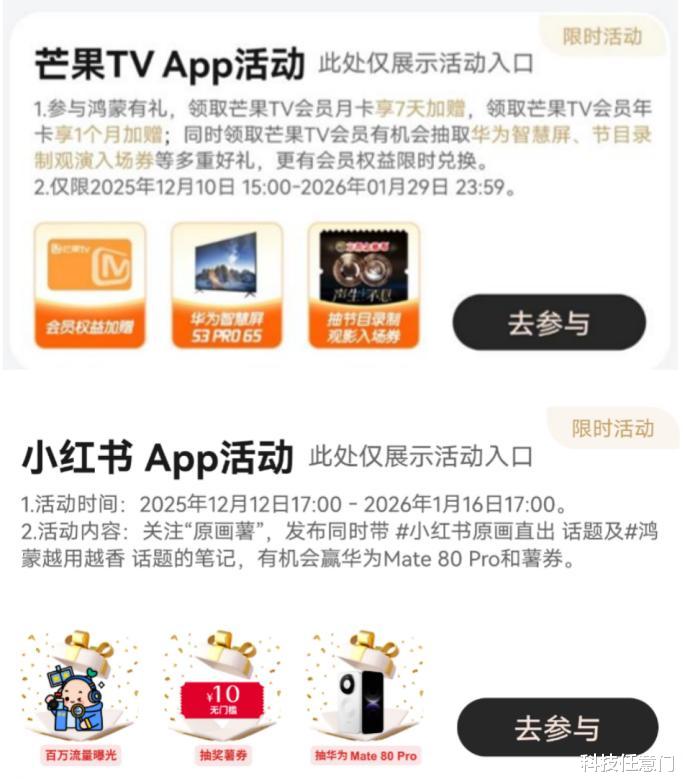 另外,我还发现芒果TV和小红书也有针对鸿蒙用户的“礼上加礼”。兑换芒果月卡额外加赠7天,兑换年卡加赠1个月!还有机会抽华为智慧屏和节目录制观演入场券。平时喜欢刷小红书的朋友,关注“原画薯”,发笔记带上 #小红书原画直出 和 #鸿蒙越用越香话题发笔记,甚至有机会抽华为Mate 80 Pro!这波福利也太香了吧!