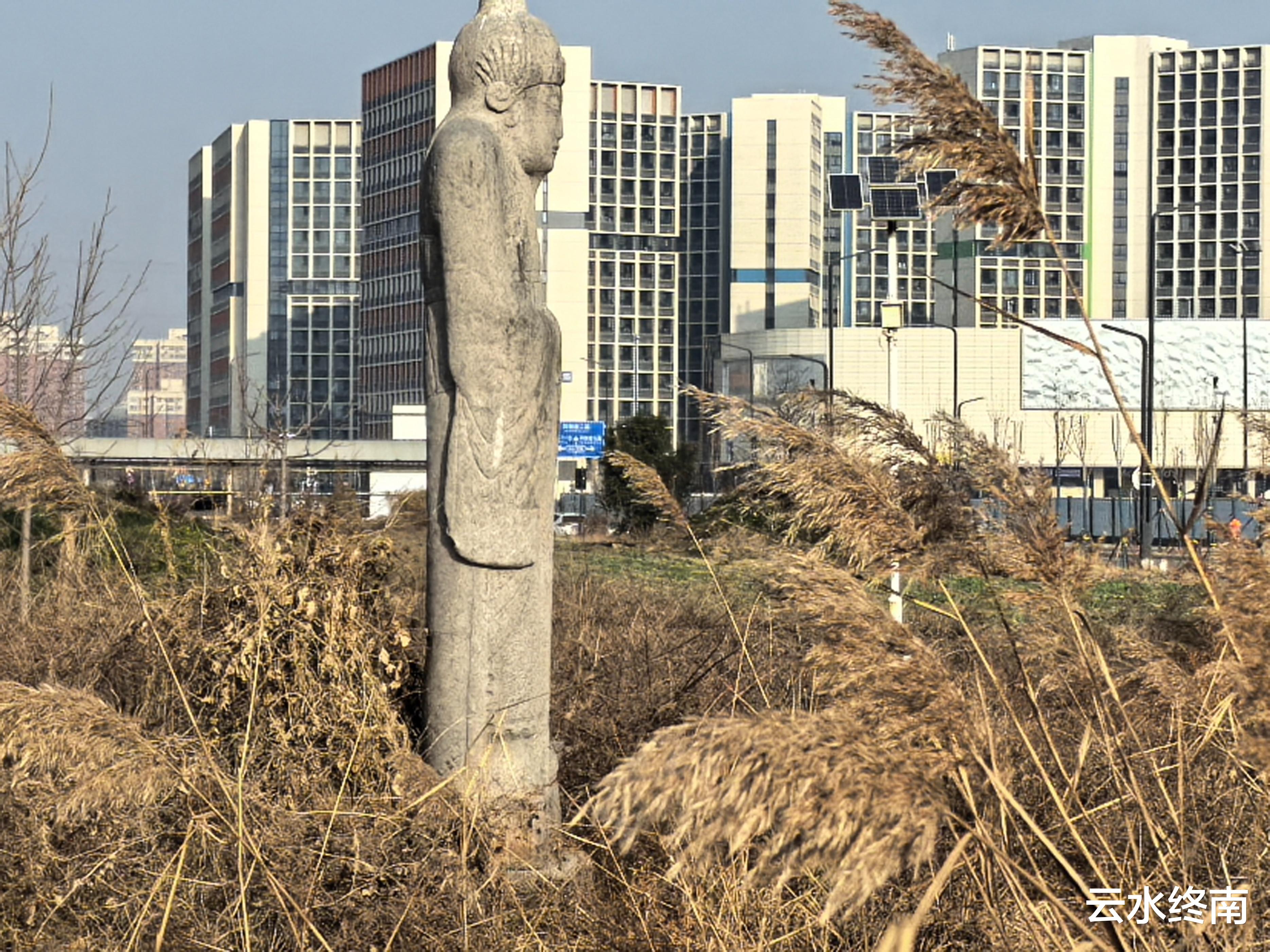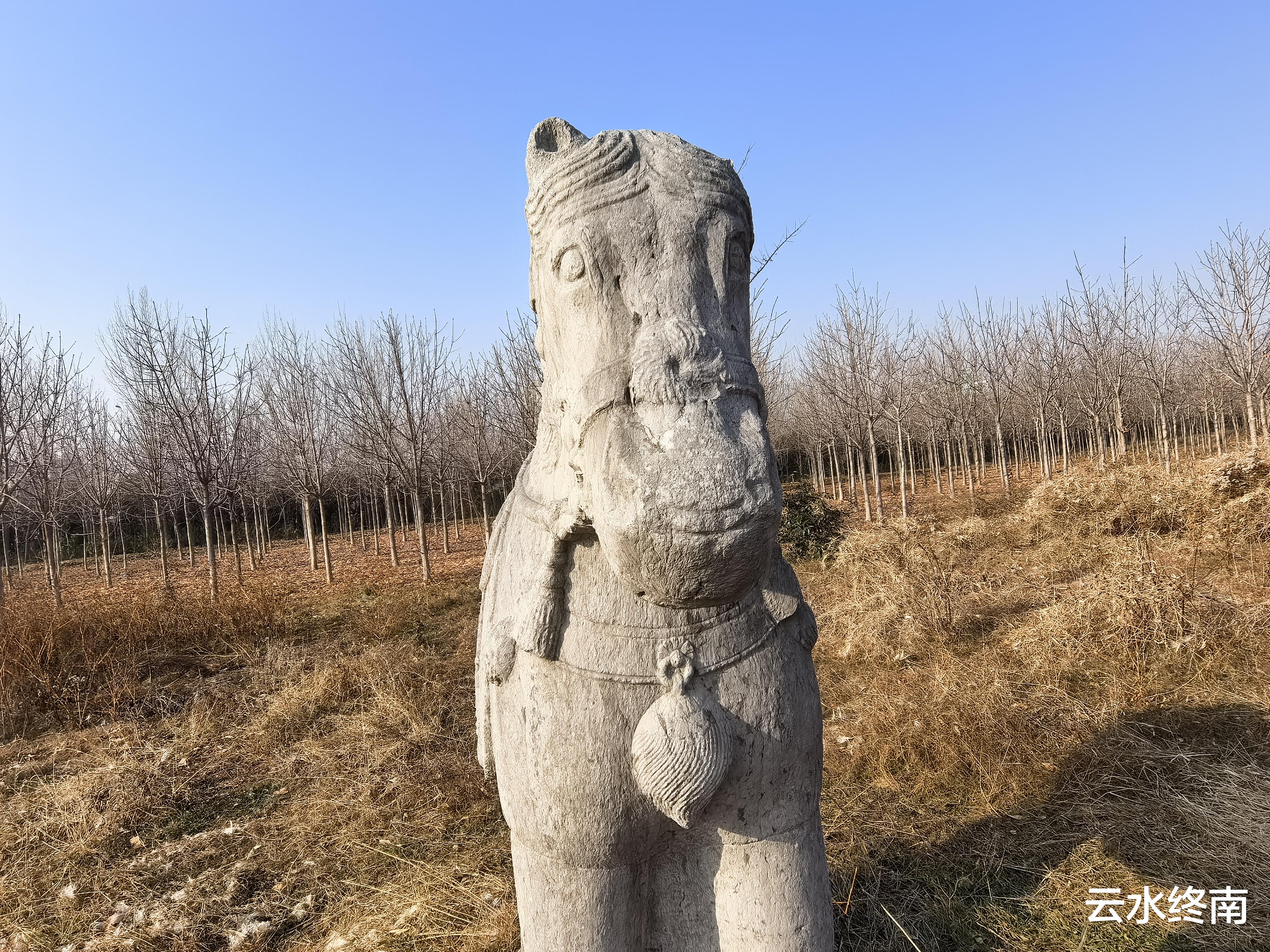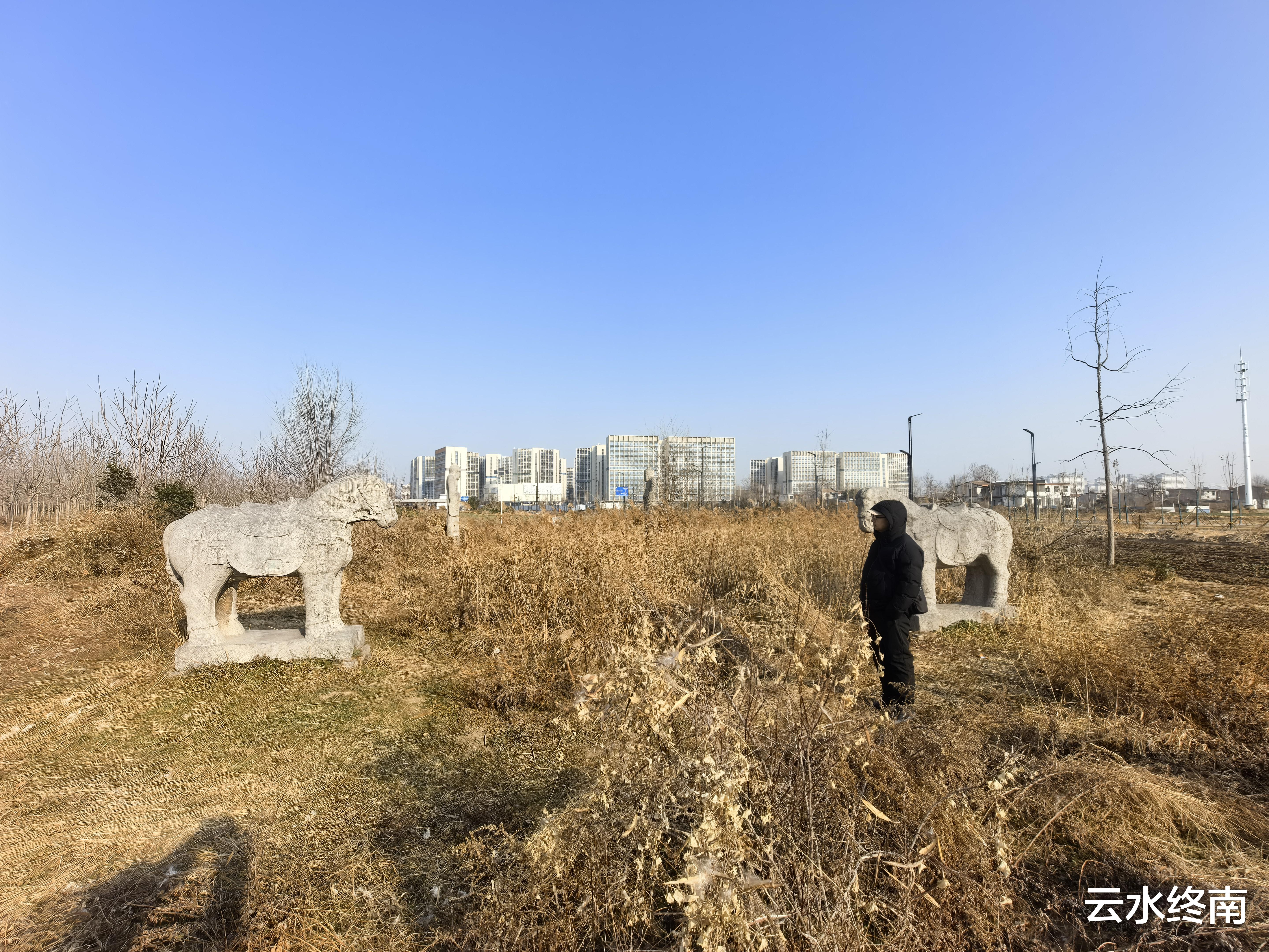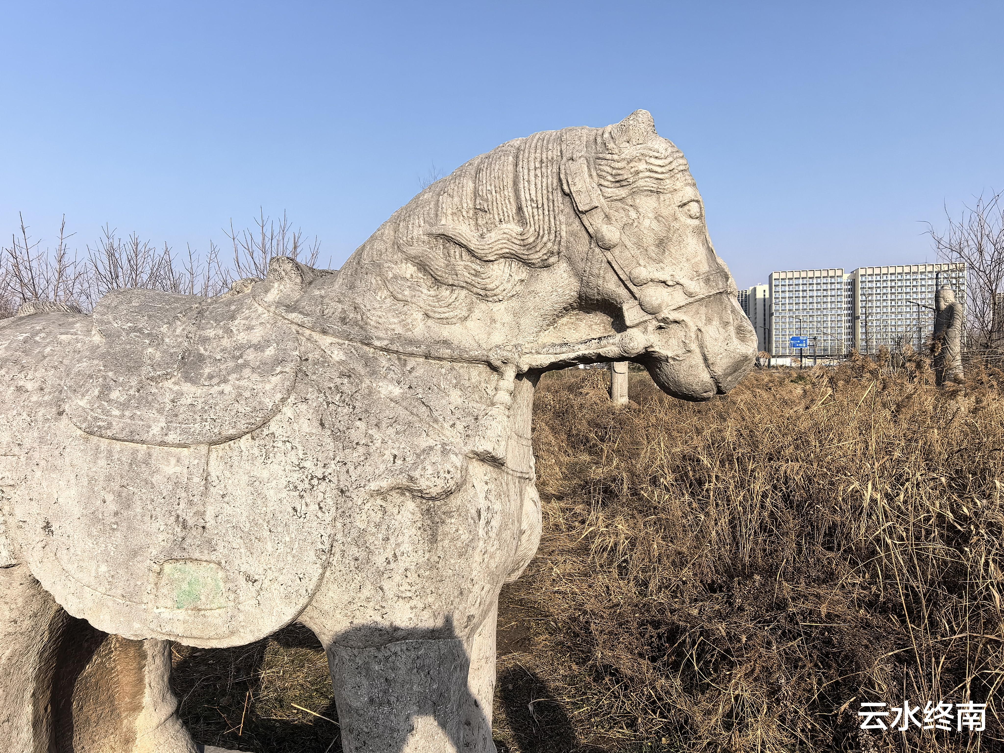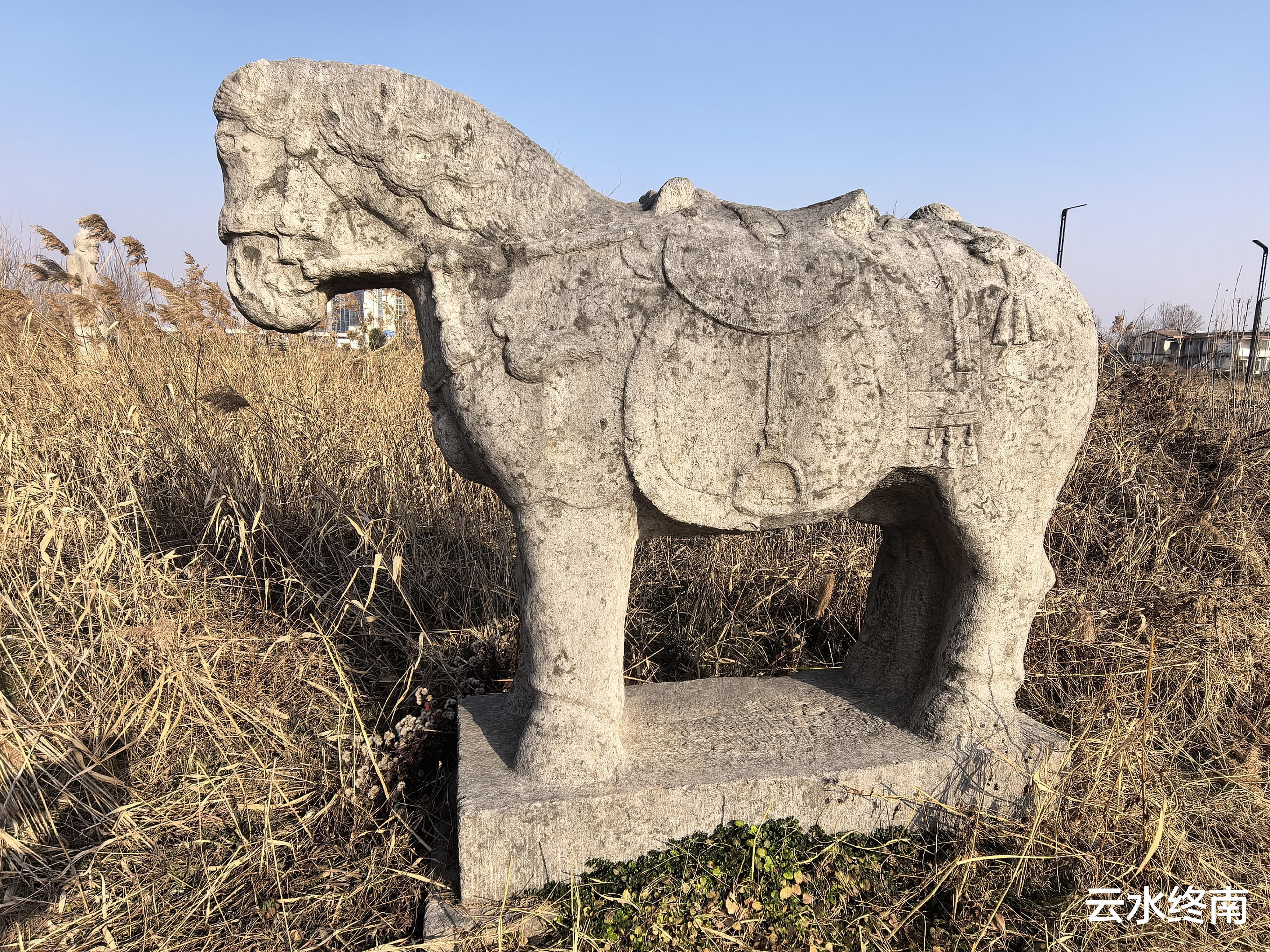 地图有导航,车快到到西江渡村,就看到田野中高大的石人石马。
