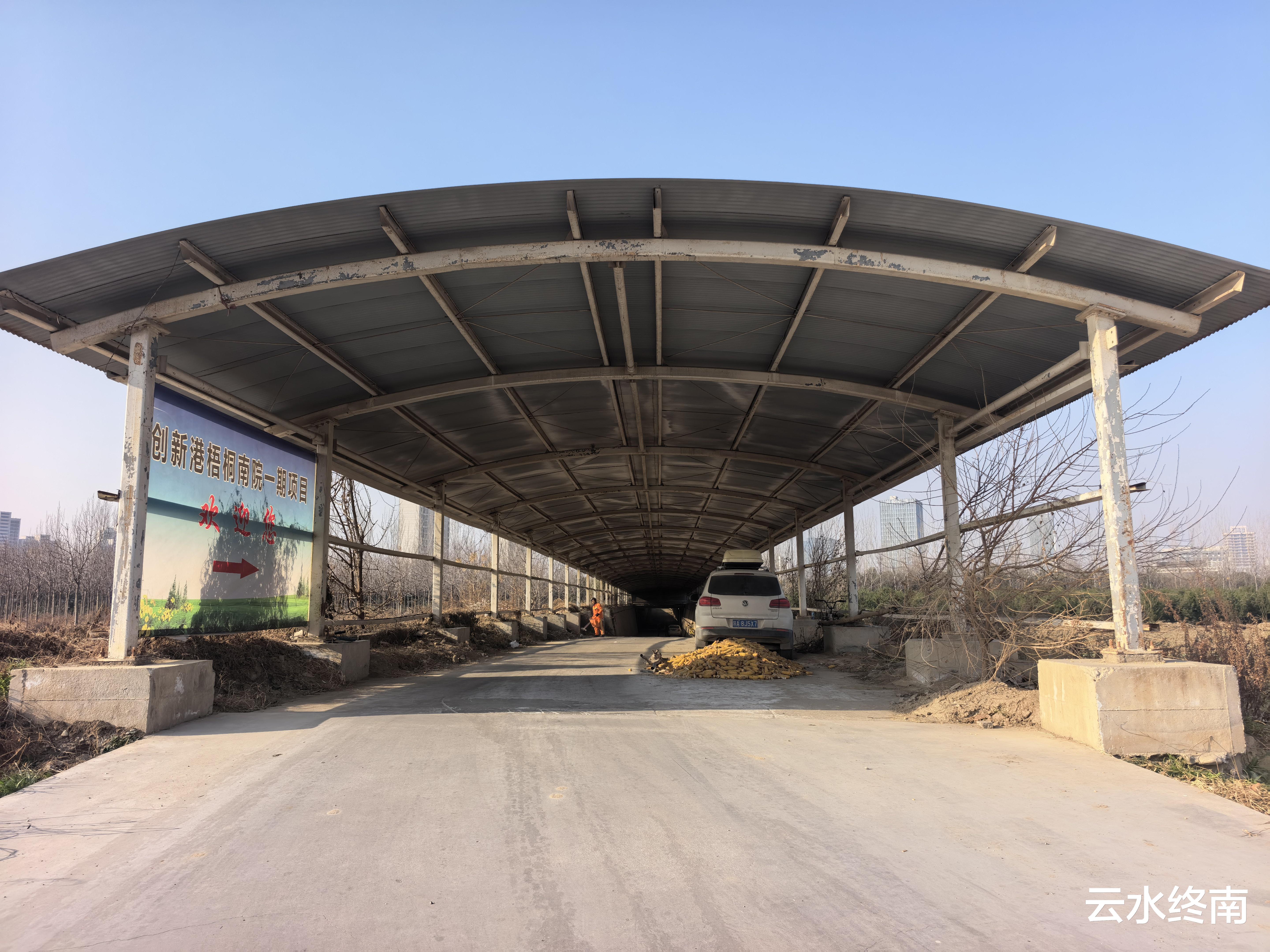 他所站立的路口有意思,这条路竟然用棚子盖着。保洁说是村人还要从这条路过去劳作,下面的涵洞怕被水淹,就用棚子盖住了。