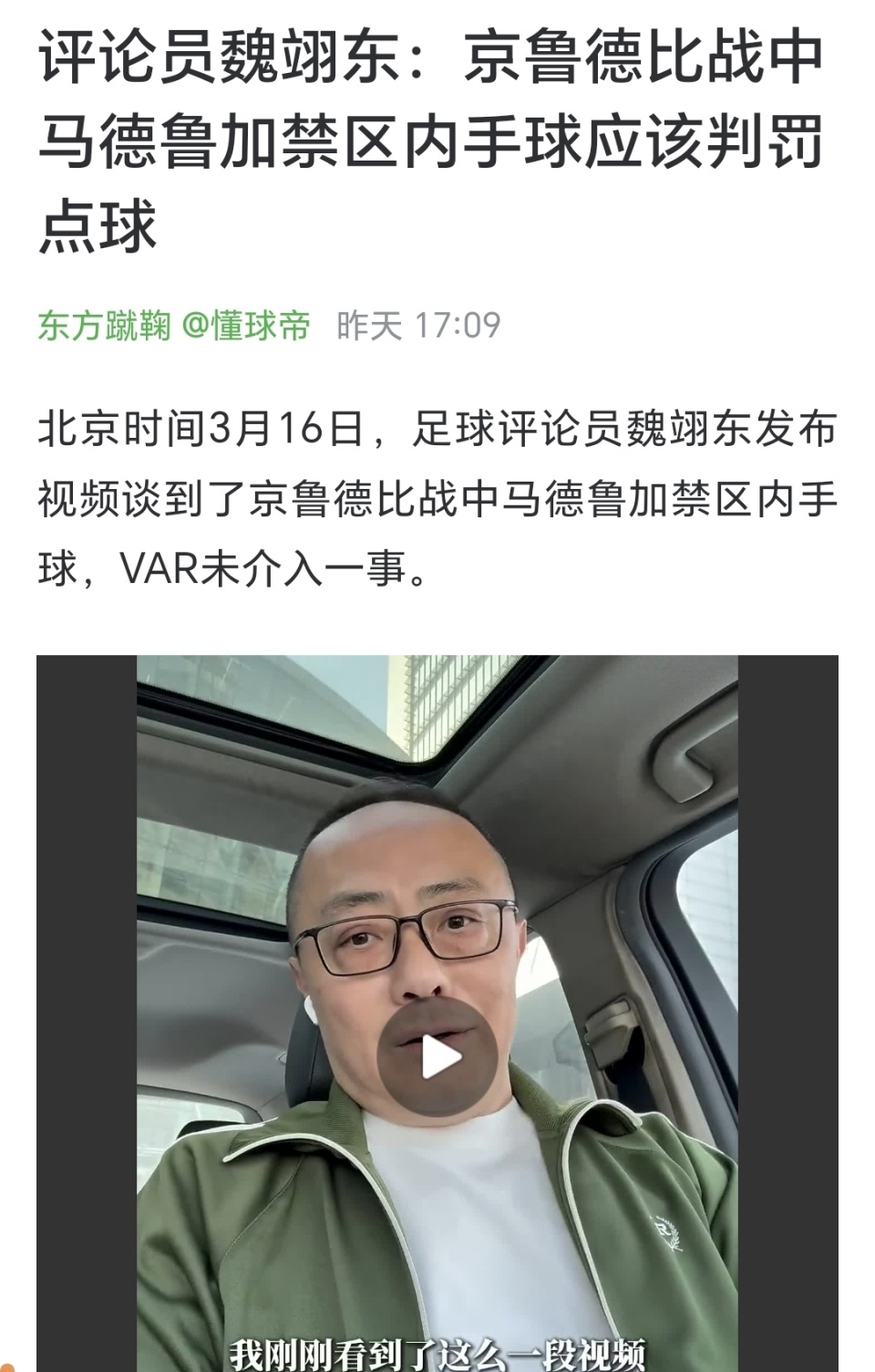3 月 16 日,北京电视台体育频道评论员魏翊东发布了一段视频。视频由现场小型设备拍摄,画面清晰地显示皮球与马德鲁加张开的手臂发生接触。魏翊东在视频中强调这是 “纯技术帖”,他质问:这样的手球是否该判点球?如果主裁判失察,VAR 为何不介入?他直接质疑现场多台高清摄像机为何没能触发 VAR 程序,而一段手机视频却能记录下关键画面。