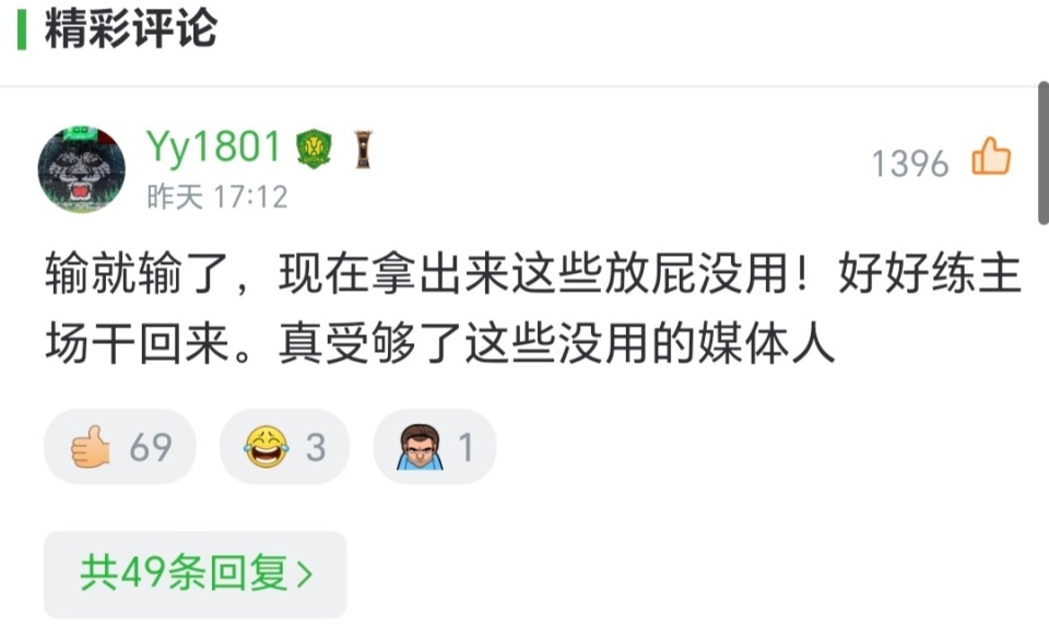 讽刺的是,这位资深评论员 “鸣不平” 的举动,并未得到自家球迷的拥戴。在他的视频评论区,一条点赞过千的评论写道:“输就输了,现在拿出来这些放屁没用!好好练主场干回来。真受够了这些没用的媒体人。” 另一条高赞评论则更为直接:“好好准备下一场不好吗?天天带节奏。” 球迷的怒火,似乎更多指向了这种 “事后诸葛亮” 式的争议复盘。