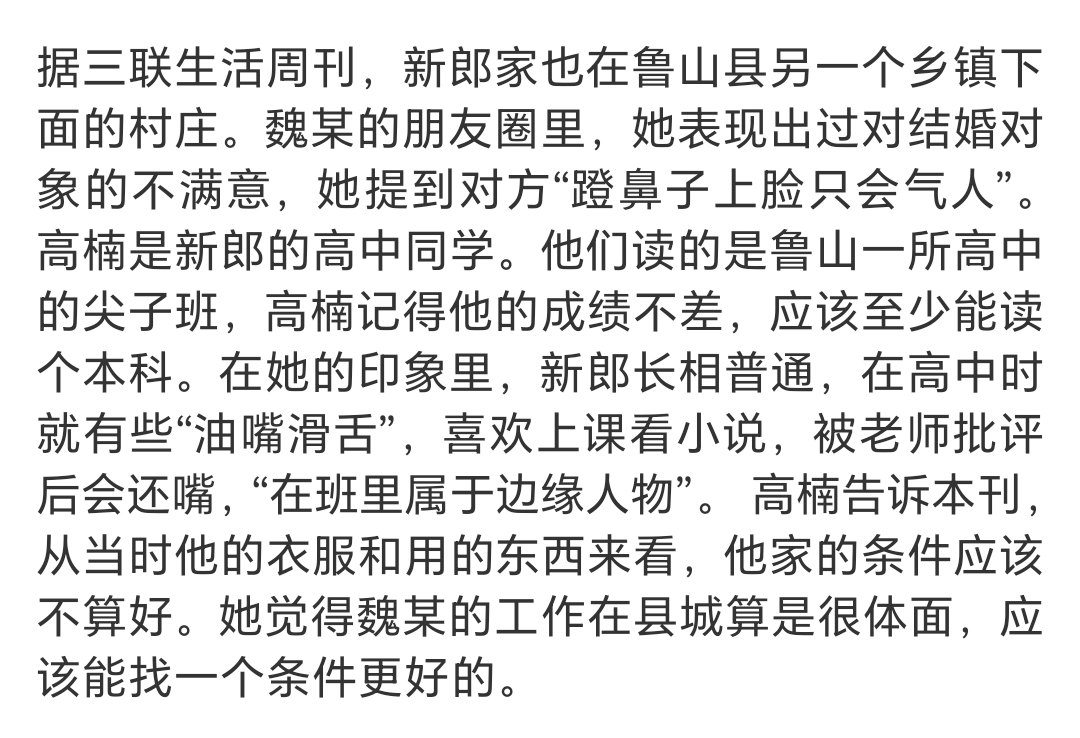 高楠觉得魏老师在县城的工作那么体面,长相也出挑,工资待遇也不低,原本应该找一个条件更好的,话里话外意思就是说,新郎配不上魏老师。