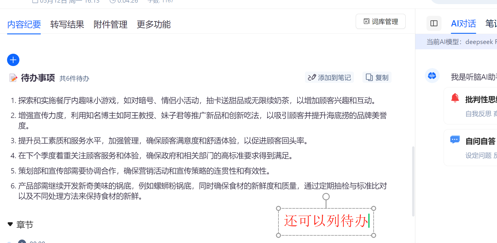 之前我和客服交流,询问他们未来软件会增加哪些功能。客服透露,可能会与 OA 系统结合,实现自动将纪要同步到项目群,或者生成行动计划提醒。我听了之后眼睛一亮,如果真能实现自动把 “Action Items” 同步到我的日历,还能贴心提醒我 “明天要跟小张要物流计划”,那可太方便了,连设置闹钟的步骤都能省掉。
