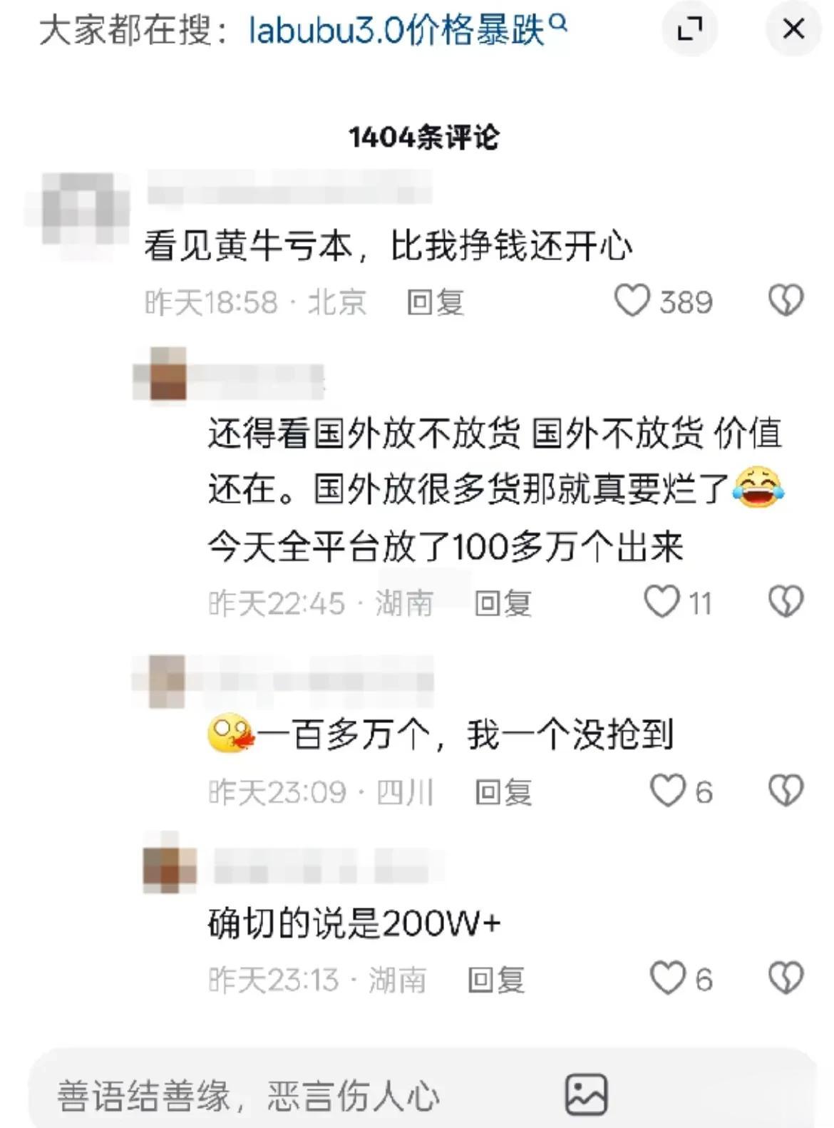 黄牛的信心彻底瓦解。在社交平台上,有人直接发帖宣布:“Labubu系列暂停收货,全盘系列大跌价,等待牛市回归。” 还有黄牛看着手里积压的货,无奈苦笑:“如果卖不完,只能自己玩了。”