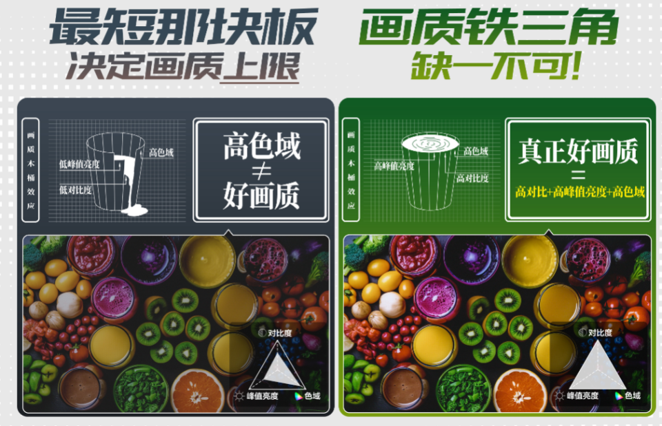 真正的好画质是怎样的?其实真正的好画质,从来都不是单一某个参数可以实现的!真正的好画质必须靠高色域 + 高对比度 + 高峰值亮度的画质铁三角支撑,三者缺一不可,少了任何一个,画面的质感和真实度都会大打折扣。