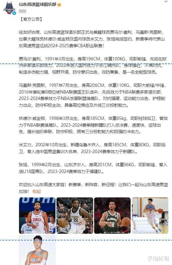 借着夏季联赛取得大胜之际,山东高速一口气官宣了5位新援加盟,除了三名外援,此前在球队试训的米艾力与张旭也获得了俱乐部给出的正式合同,看来这个休赛期,山东高速是完全遵照邱彪指导的意思来引援。虽然感觉都是其他球队不要的边角料,但只要磨合好,未必不会形成即战力。