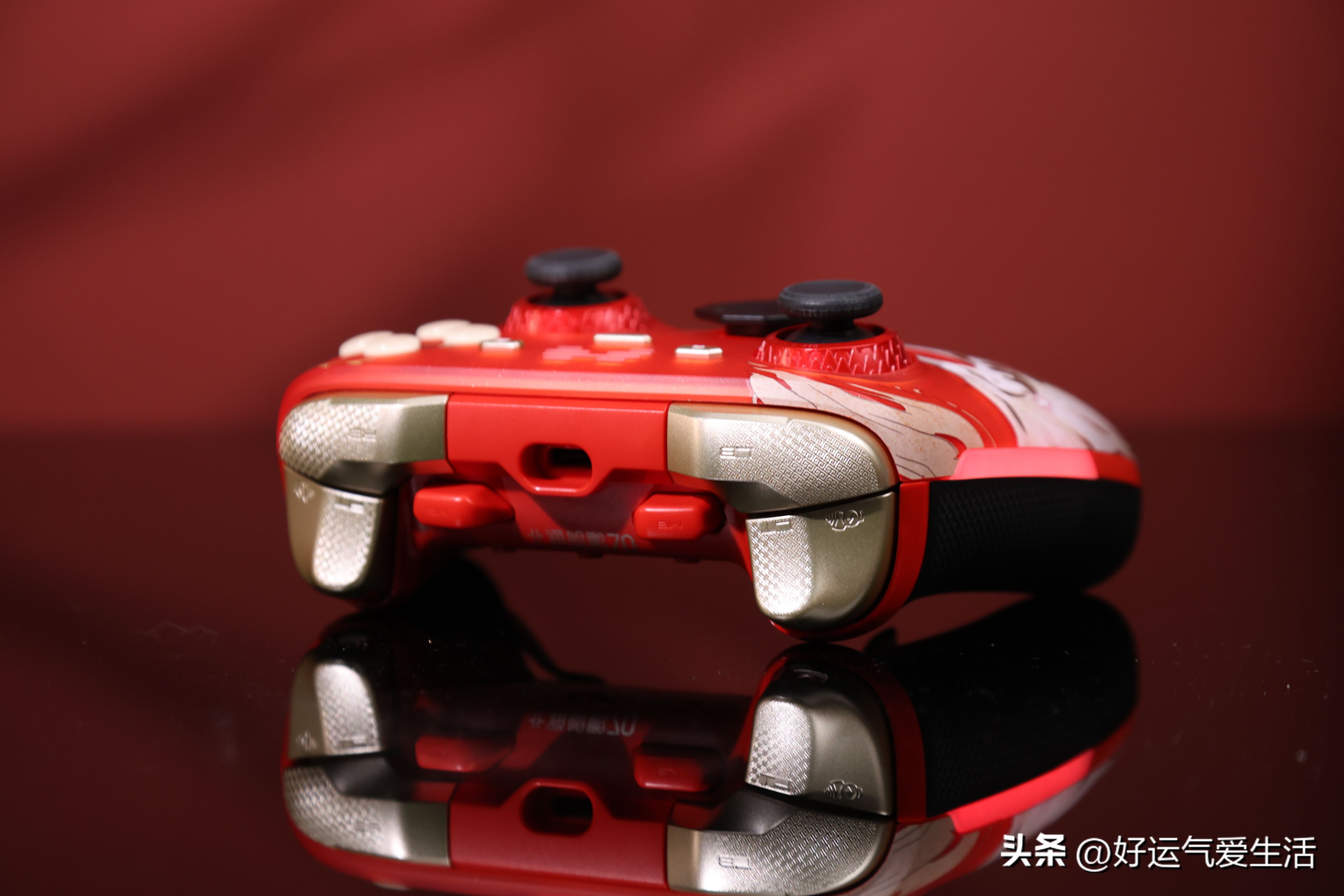 手柄本体的设计走的是偏收藏级的路线。中国红磨砂面壳搭配烫金奔马纹样,摇杆阻尼环用了亮眼的金属红,技能键、ABXY 和顶部按键是鎏金点缀,但整体并不花。真正高频接触的摇杆、十字键和握把区域统一用了墨黑色,既耐脏也更实用。重量在 280 克左右,拿在手里有分量但不压手,属于很扎实的那种握持感。