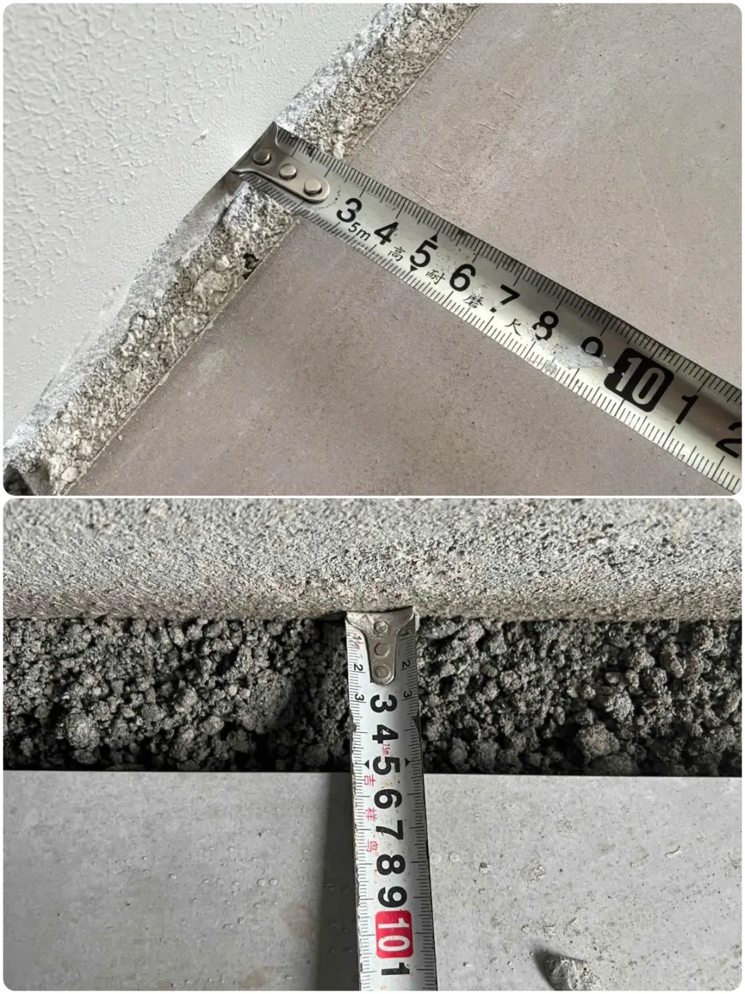 ▲正常来说,强固与背胶同时使用时,水泥浆贴砖都不会掉下来;上图用纯瓷砖胶贴砖却整片掉落,更多的应该是瓷砖胶使用不规范造成的,例如搅拌不当,添加水泥,铺贴厚度较厚等施工问题。瓷砖胶薄贴前,墙面需要归方找平,瓷砖胶厚度需控制在3-5mm之间,墙面平整度不够,用瓷砖胶来找平,出问题时肯定的。卫生间墙砖脱落