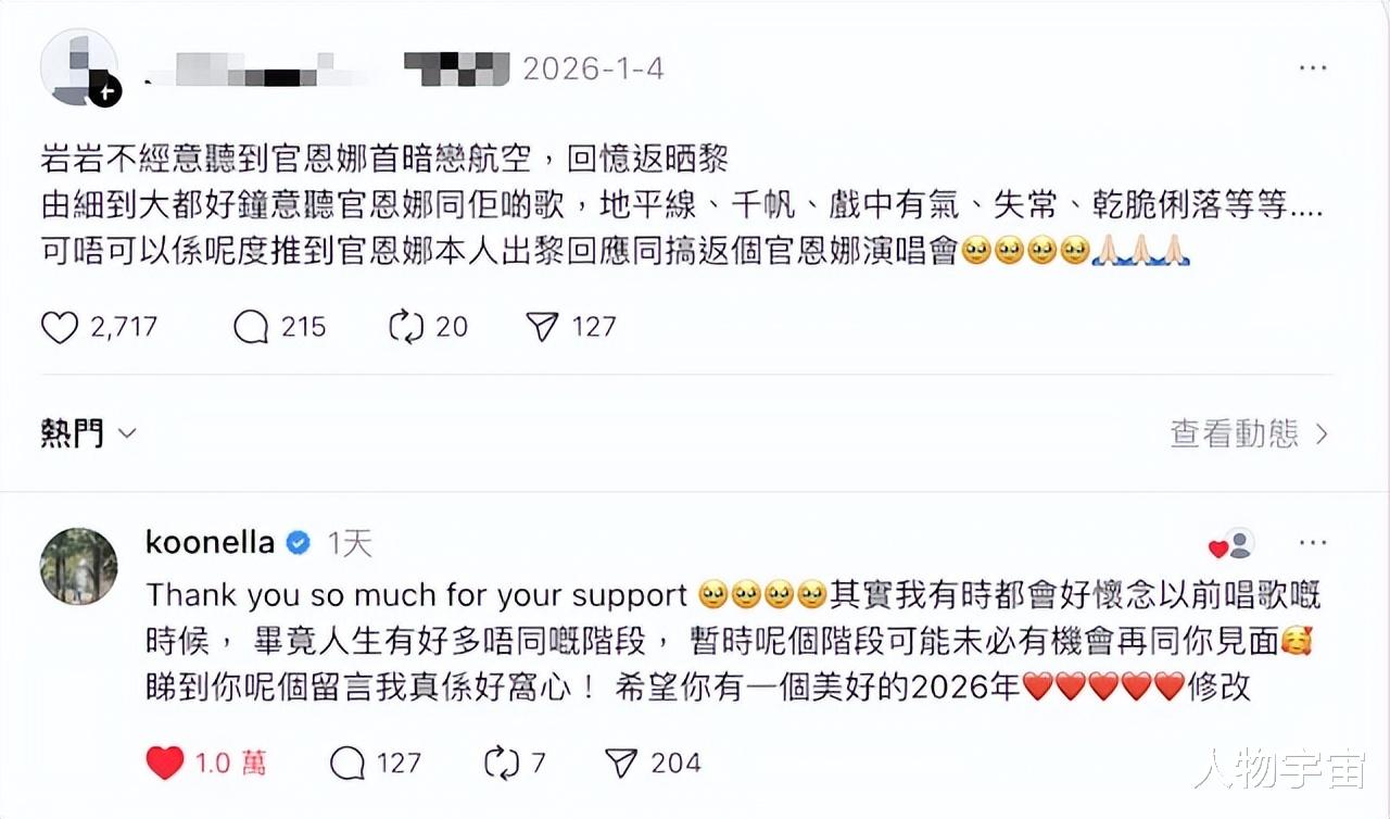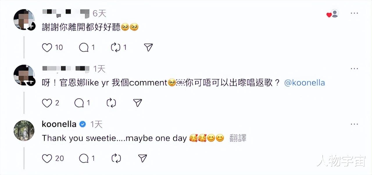 面对粉丝呼唤她复出开演唱会的声浪,官恩娜的回应温柔而暖心。她坦言有怀念唱歌的日子,但人生阶段不同,现阶段的她更享受陪伴孩子成长的点滴。