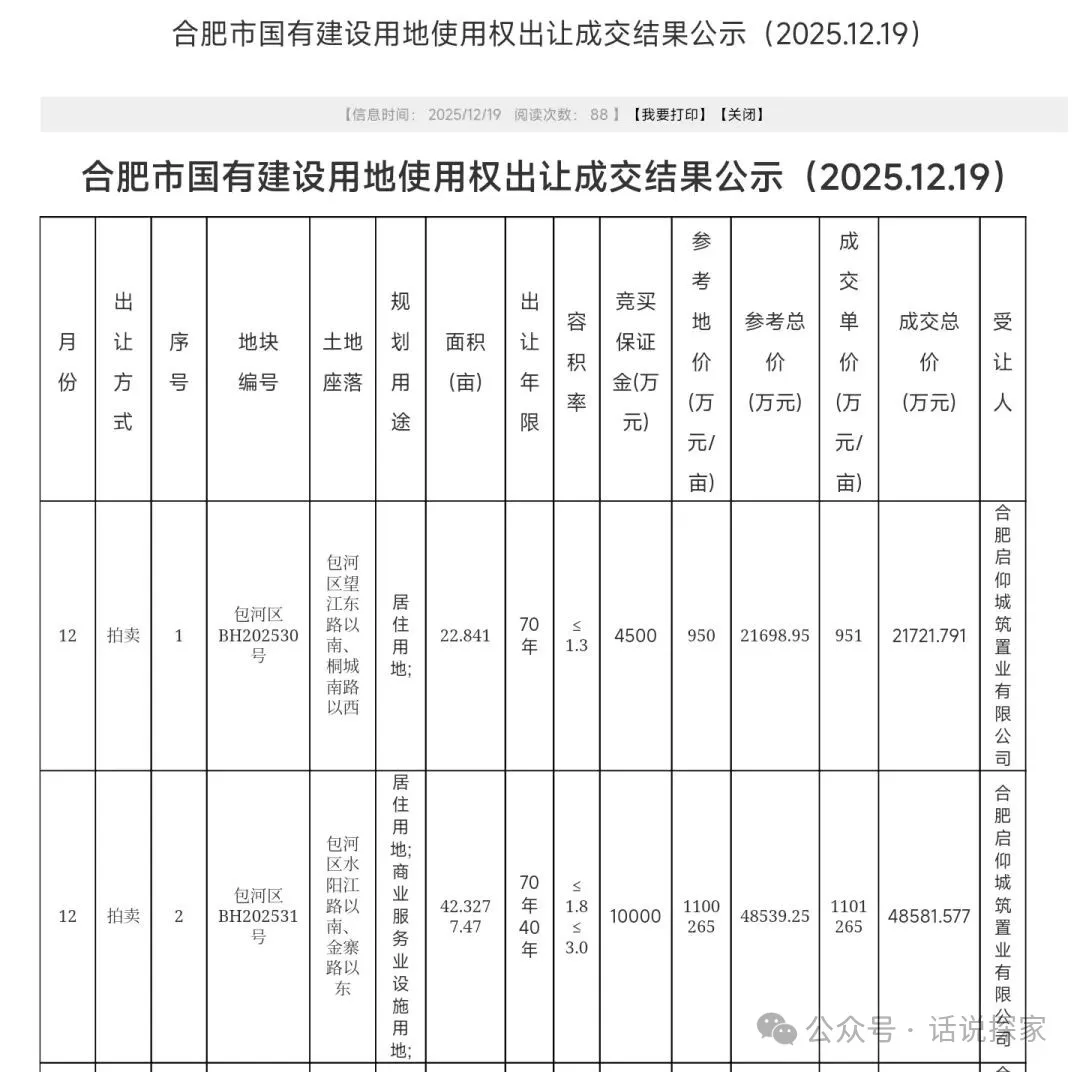 12月19日,今天合肥迎来2025年的土拍末班车,本月的第一批土拍,共计6宗涉宅地块,成交金额约17.5亿,总占地面积为173亩。