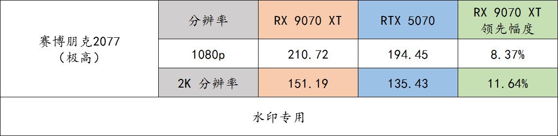 ▲ 《赛博朋克 2077》游戏 benchmark 实测。9070 XT 在 1080P 分辨率下领先 8.37% 的游戏流畅度,在 2K 分辨率下领先 11.64% 的游戏流畅度。
