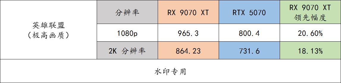▲ 《英雄联盟》实测,采用训练模式记录中路破三个塔的全过程,并求得平均值。对于显存要求不高的游戏,9070 XT 领先幅度就比较正常,大概在 20% 左右。