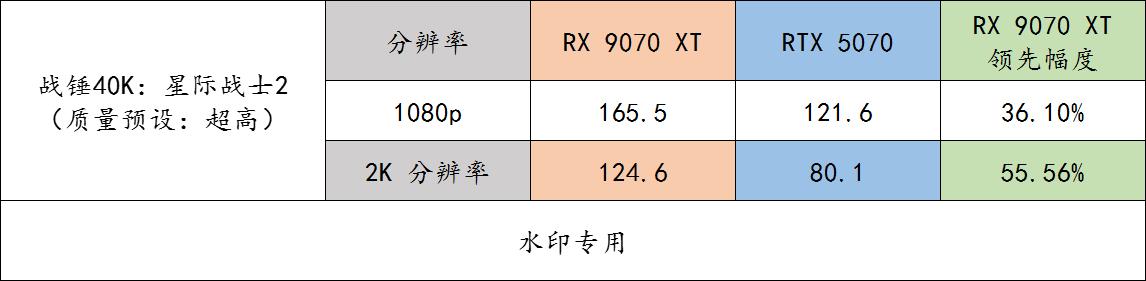 ▲ 《战锤 40000 星际战士 2》实机测试,这也是主打光栅的游戏,9070 XT 领先的幅度非常大,并在 2K 分辨率上实现了更大幅度的领先,这跟 9070 XT 的显存容量更大有关系。