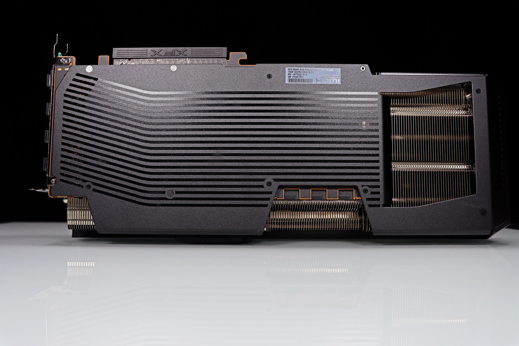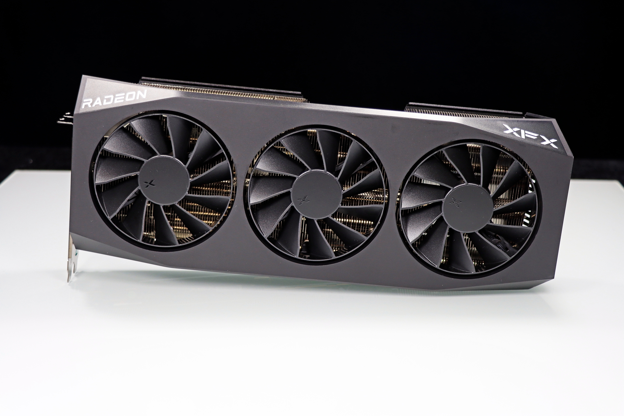 ▲ XFX 的品牌 LOGO。显卡的导流罩末端采用封闭设计,显卡末端的热量更多通过对流穿透区域进行散热。
