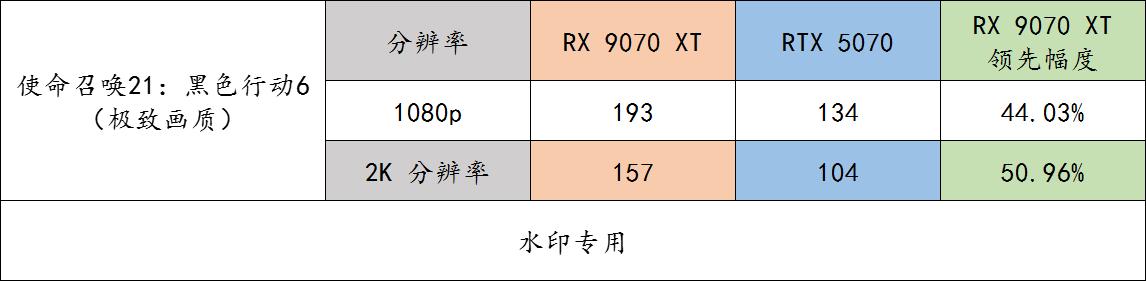 ▲ 《使命召唤 21 黑色行动 6》benchmark 实测。这个游戏是光栅为主的游戏,对 AMD 显卡非常友好,所以你就看到了非常炸裂级别的游戏流畅度领先。得益于 9070 XT 的大显存,2K 甚至更高分辨率优势会变得更明显。