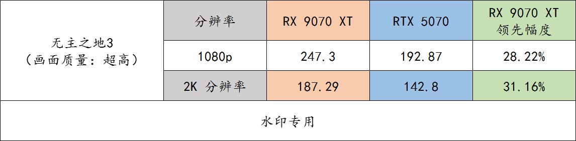 ▲ 《无主之地 3》benchmark 实测。对于光栅呈现更多的游戏,9070 XT 的优势会更加大,而且还会随着分辨率的提升而与 5070 拉大差距。