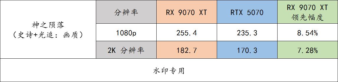 ▲ 《神之陨落》游戏 benchmark 实测。游戏采取史诗级画质 + 光追:画质。9070 XT 在这款游戏里的领先幅度很稳定。