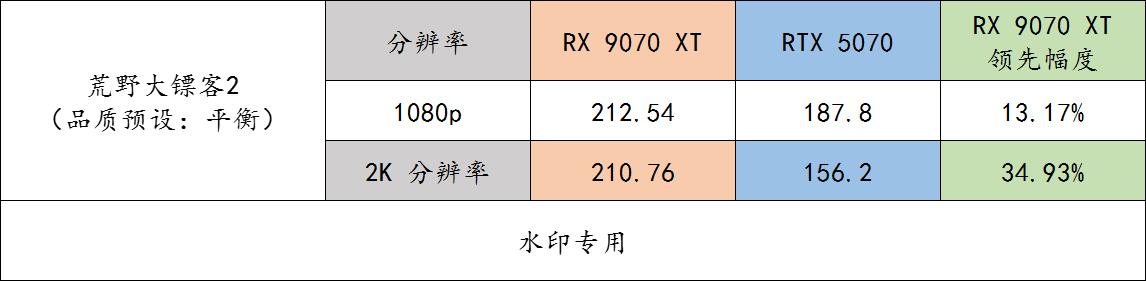 ▲ 《荒野大镖客2:救赎》游戏 benchmark 实测。这个游戏非常有趣.........1080P 下感觉 9070 XT 没吃满,因为跟 2K 分辨率的成绩差不多,但是 RTX 5070 在两个分辨率下就差别大了。
