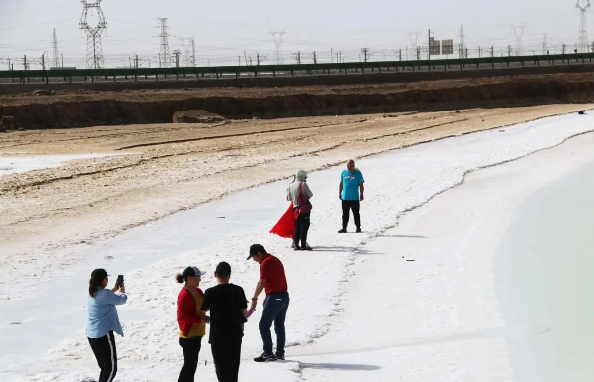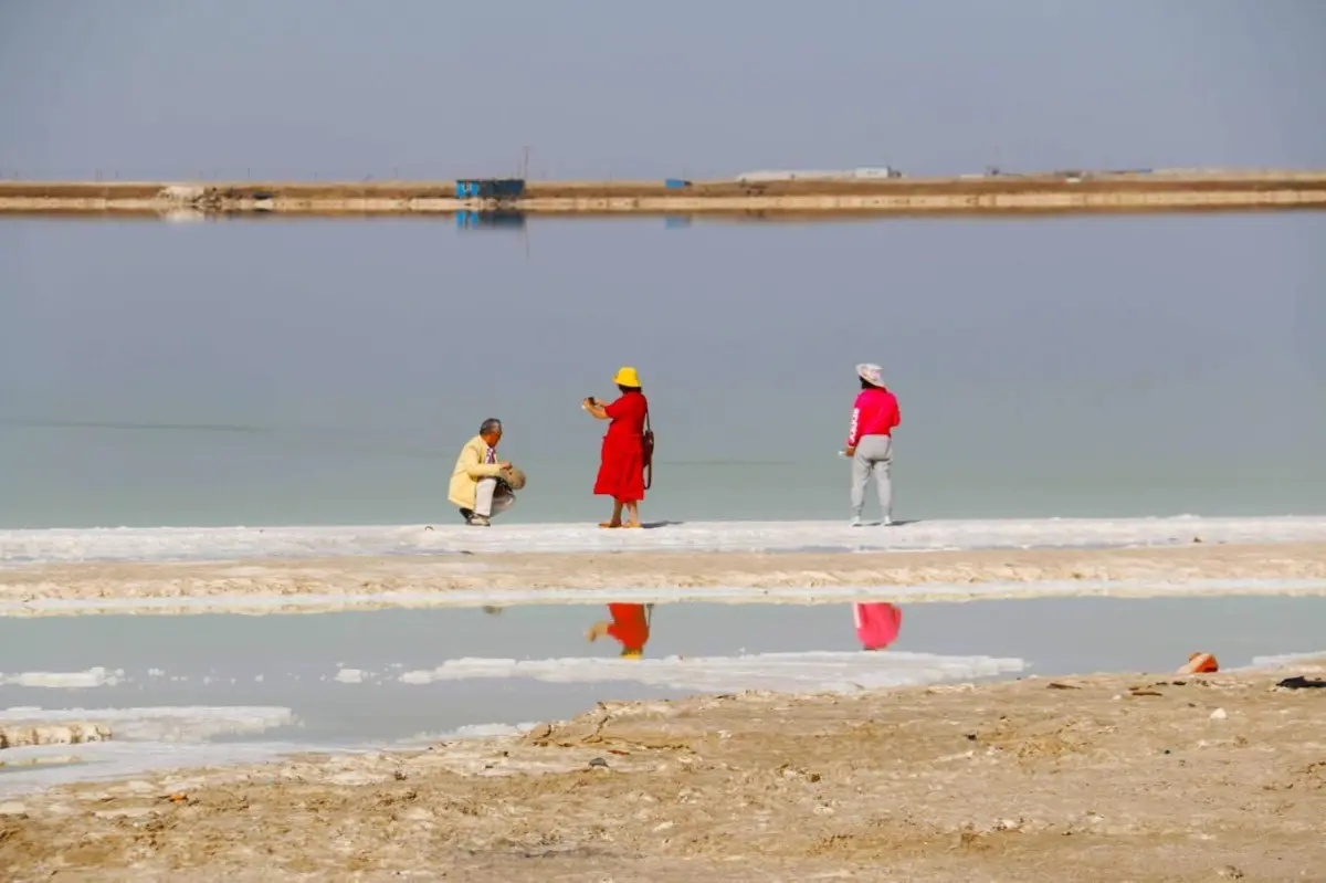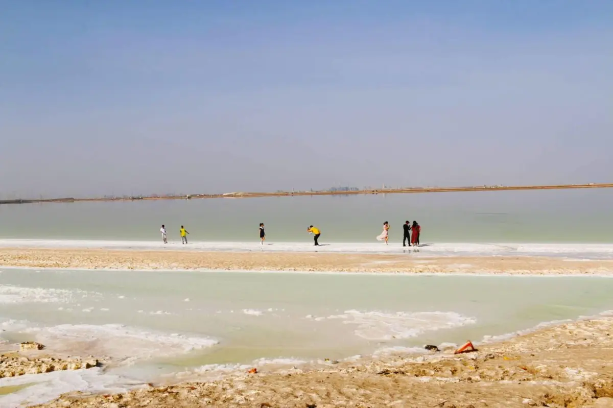 隔着湖水的对岸,各种盐化工企业鳞次栉比排列着,把这湖水中的白色宝藏变成言语不多的工业产品。没能进入真正的景区或许稍有遗憾