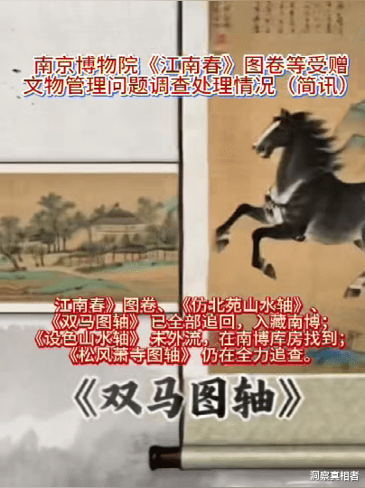《江南春》图卷、《仿北苑山水轴》、《双马图轴》 已全部追回,入藏南博;